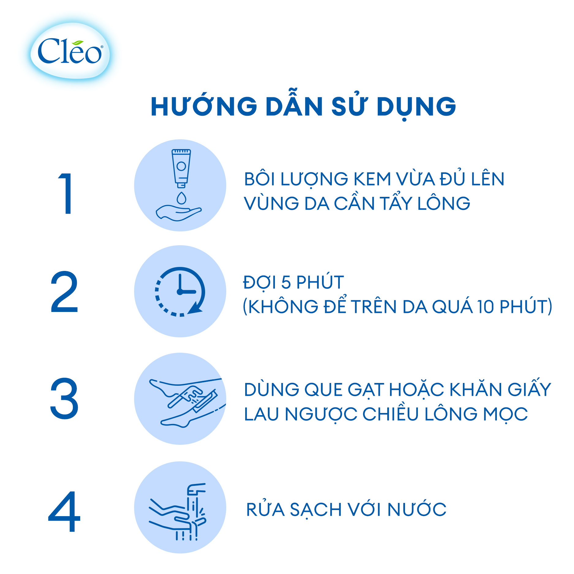 Kem tẩy lông Cléo dành cho da nhạy cảm, an toàn, hiệu quả trong 5 phút, không đau rát 50g Hiệu quả tẩy lông nhanh, láng mịn, 100% không đau. Giải pháp tẩy lông hiện đại cho loại da nhạy cảm. Thích hợp cho vùng da nách, viền bikini. Chỉ trong vòng 5 phút, làn da đã trơn mịn, sạch lông hoàn toàn, để lại nền da mềm mại & ẩm mượt đến bất ngờ   Chăm sóc da sau tẩy lông, dưỡng da mềm mịn Kem tẩy lông Cléo dành cho da nhạy cảm, an toàn, hiệu quả trong 5 phút, không đau rát 50g Với công thức vượt trội có khả năng tẩy SẠCH LÔNG NHANH và 100% KHÔNG ĐAU khi sử dụng. Ngoài ra, Cléo được đặc chế chứa thành phần thiên nhiên lành tính gồm chiết xuất từ trái bơ tươi thiên nhiên, vitamin E, dầu jojoba giúp DA SÁNG MỊN hơn sau khi tẩy. Tất cả sản phẩm kem tẩy lông Cléo đều được kiểm nghiệm bởi Sở làn da nhạy cảm Y Tế TP.HCM về độ an toàn và dịu nhẹ đối với làn da, đặc biệt đối với HƯỚNG DẪN SỬ DỤNG KEM TẨY LÔNG CLÉO Hướng dẫn sử dụng Kem Tẩy Lông Cléo Kem Bơ. Để sử dụng Kem Bơ Tẩy Lông Cléo một cách hiệu quả, bạn nên đọc kỹ và làm theo hướng dẫn sử dụng.