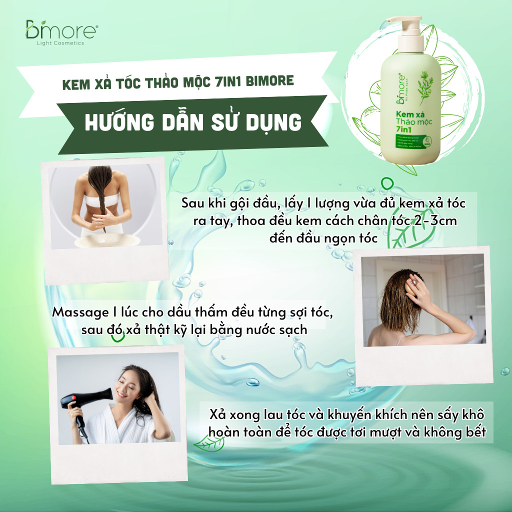 TRƯỚC KHI GỘI Ủ TÓC, SAU KHI GỘI LÀM GÌ? Nếu đã là một tín đồ dưỡng tóc của Bimore, thì hẳn bạn đã quen với quy trình ủ tóc với Hỗn hợp ủ tóc 7in1 trước mỗi lần gội đầu, để tăng cường dưỡng chất, giúp thúc đẩy mọc tóc và làm tóc suôn mềm hơn. Nhưng không chỉ dừng lại ở đó, thói quen sau mỗi lần gội – dưỡng tóc bằng dầu xả – cũng quan trọng không kém để tạo ra hiệu quả dưỡng tóc, phục hồi tóc toàn diện. Bimore đã chính thức ra mắt sản phẩm Kem Xả Thảo Mộc 7in1, hoàn thiện quy trình Ủ tóc – Gội đầu – Xả tóc 7in1 để gói gọn dưỡng chất từ thiên nhiên trong mỗi lần gội. Lớp dầu xả mềm mượt có tác dụng như một lớp màng dưỡng chất khóa chặt độ ẩm trong mỗi sợi tóc, kéo dài thời gian mềm mượt và giảm gãy rụng mỗi ngày. Nếu như với da mặt, ta cần có tối thiếu 3 bước tẩy trang – rửa mặt – dưỡng ẩm, thì với tóc, việc sử dụng thêm kem xả cũng giống như một lớp “kem dưỡng ẩm” bổ sung cho từng sợi tóc. Kem Xả Thảo Mộc 7in1 tạo ra khác biệt lớn sau mỗi lần gội nhờ dưỡng chất đậm đặc trong dầu hạnh nhân, dầu argan, bơ hạt mỡ, chiết xuất nha đam và vitamin B5. Đồng thời, công thức Kem Xả Thảo Mộc 7in1 cũng làm tóc tơi nhẹ, mềm mượt, không bết nặng khiến tóc kém bồng bềnh.