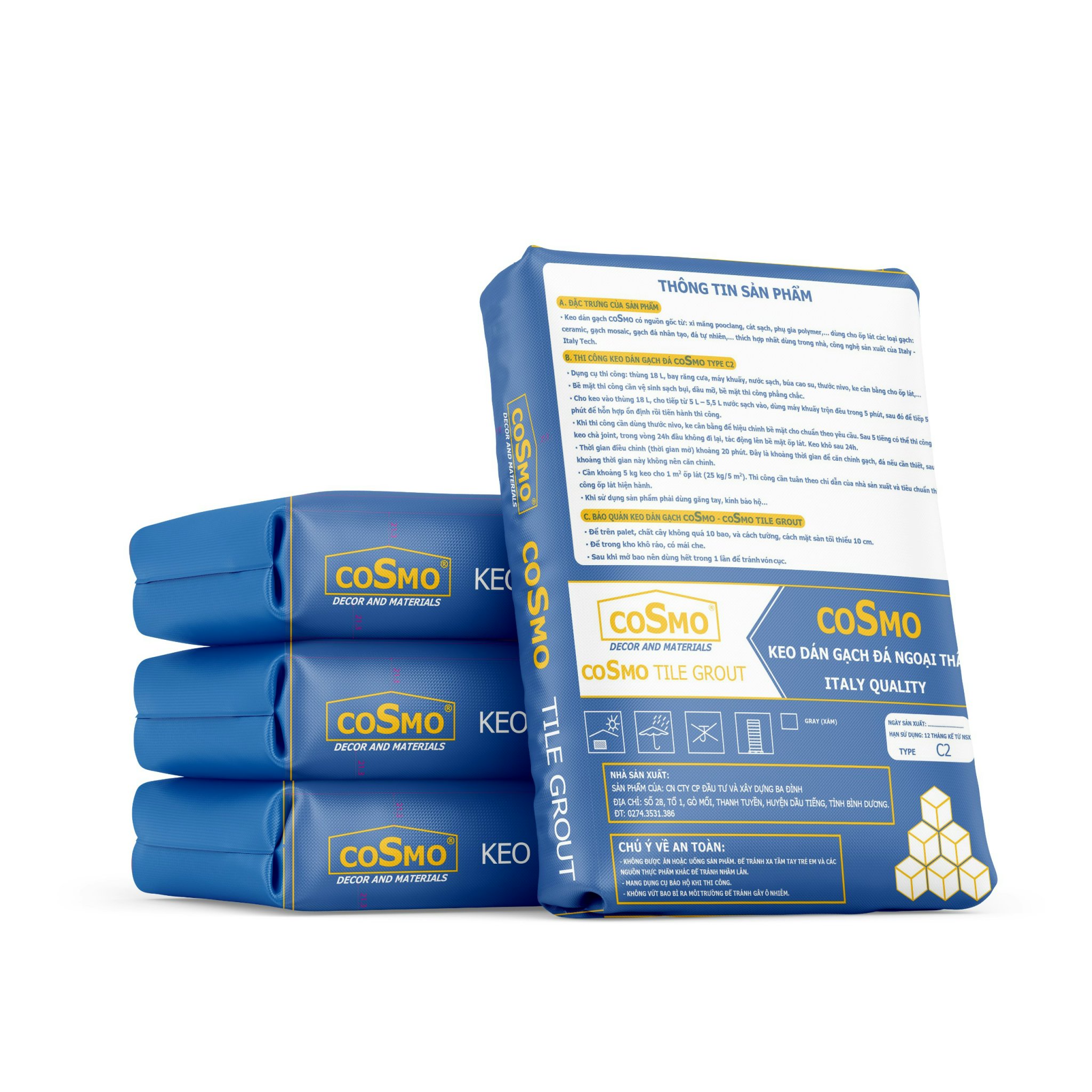 Mua tại TiktokKeo dán gạch ngoại thất cosmo Keo dán gạch thương hiệu COSMO có thành phần chính là xi măng pooclăng, cát sấy đã đượcphân cấp hạt cùng một số phụ gia polyme đặc biệt tạo nên khả năng bám dính cao và độ ổn định khi dán. ỨNG DỤNG CỦA KEO DÁN GẠCH COSMO NGOẠI THẤT LOẠI C2: