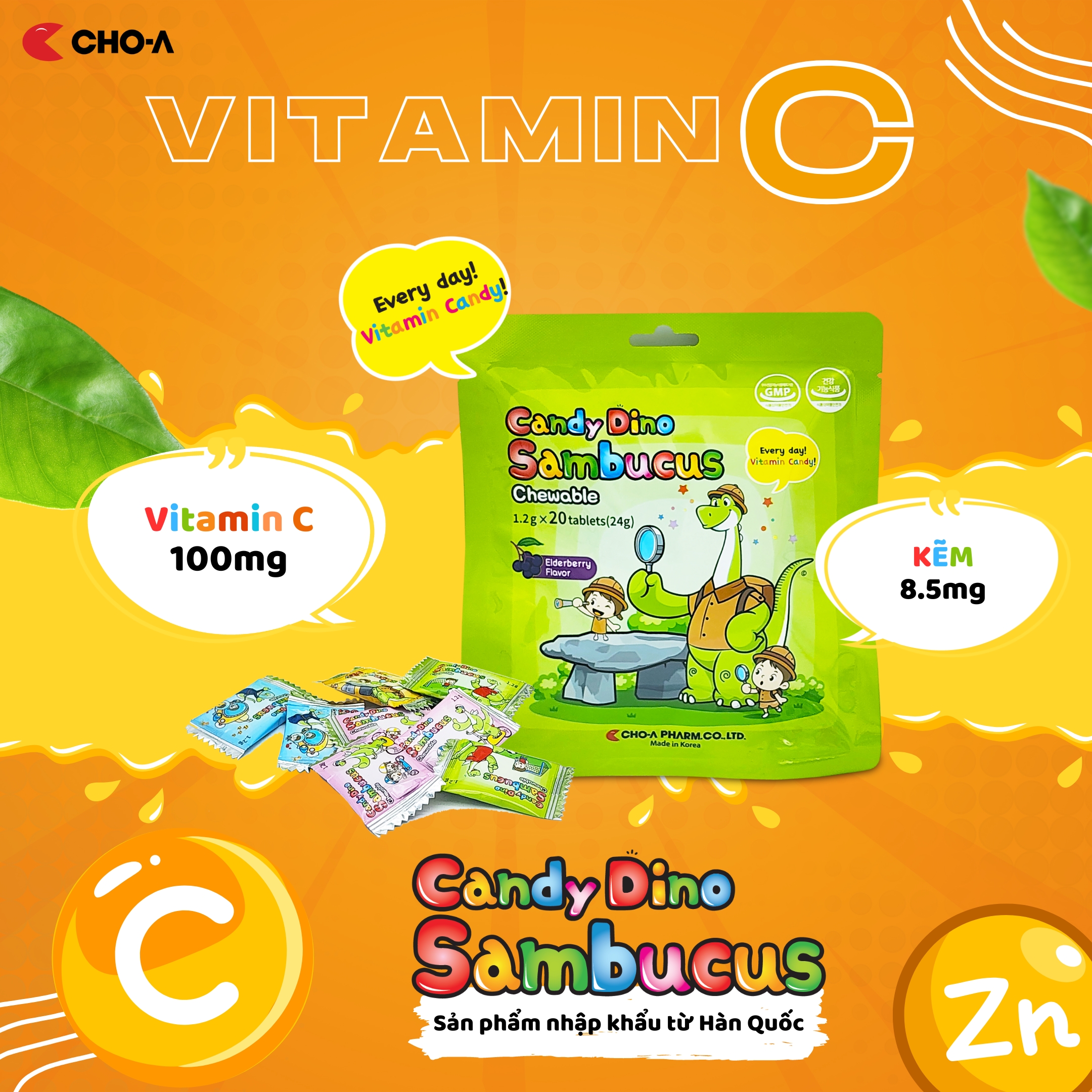 Mua tại TiktokKẸO DINO SAMBUCUS BỔ SUNG KẼM VÀ VITAMIN C GIÚP TRẺ ĂN NGON (20 VIÊN/GÓI) Đang được bán tại Hệ thống Nhà Tố của Cho-A Pharm tại Việt Nam. KẸO DINO SAMBUCUS là sản phẩm giúp bổ sung Kẽm và Vitamin C cho trẻ em, được sản xuất theo quy trình chất lượng đạt chuẩn của Hàn Quốc trên dây chuyền công nghệ hiện đại. Trong kẹo có thành phần tạo ngọt tự nhiên từ Quả Cơm Cháy - vị ngọt dễ dùng. Thực tế, Quả cơm cháy tươi chứa 80% là nước, 18% là carbohydrate, ít hơn 1% là chất đạm và chất béo. Cây cơm cháy có hàm lượng cao các vitamin A, C, B6, sắt, kali và các chất dinh dưỡng thiết yếu khác. Theo một nghiên cứu mới từ các nhà khoa học thuộc Đại học Sydney (Australia), quả cơm cháy thực sự có đặc tính chống virus cúm. An tâm hơn khi cho bé sử dụng. Công Dụng: