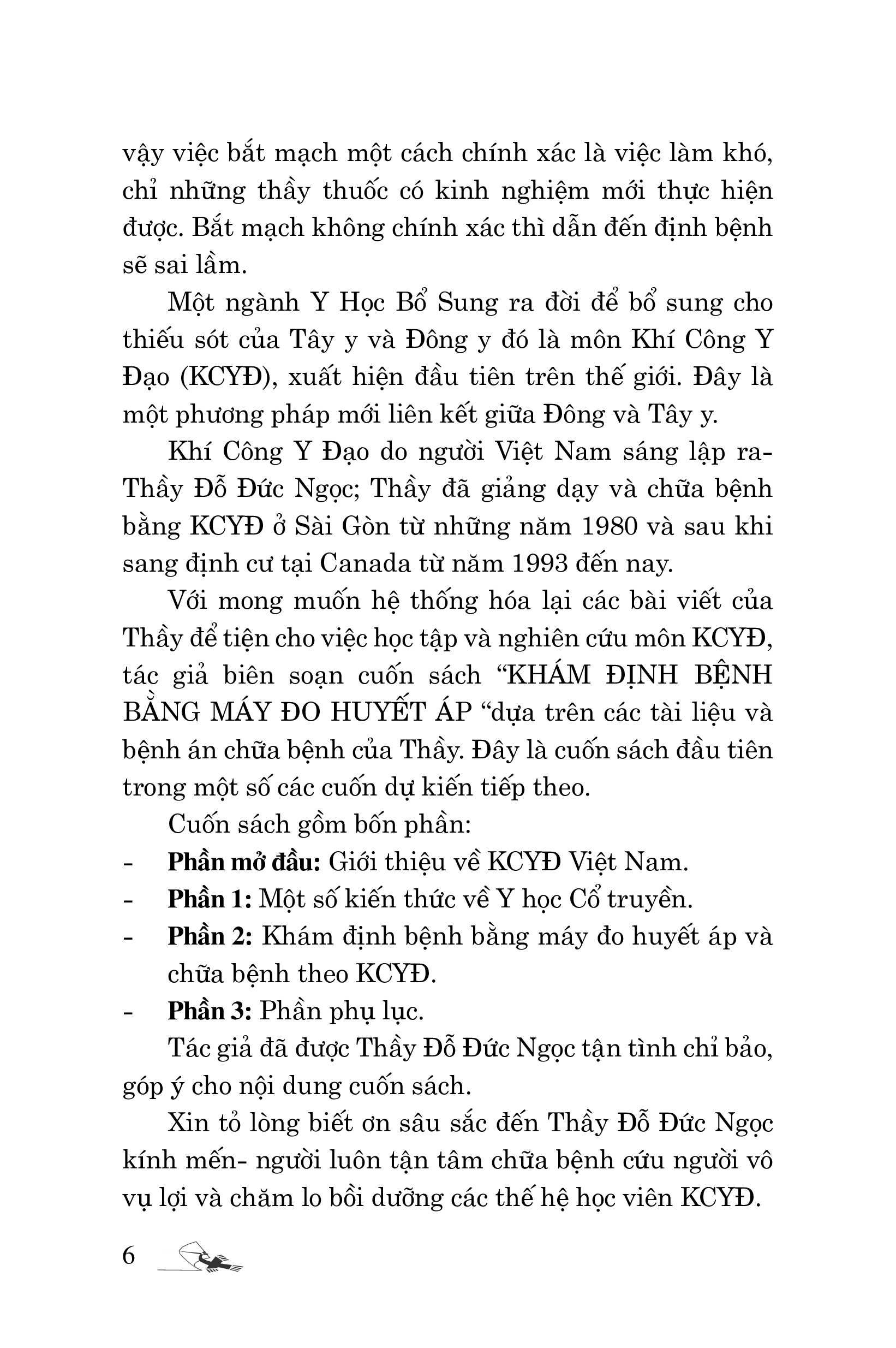- Giới thiệu Khí Công Y Đạo - Khám Định Bệnh Bằng Máy Đo Huyết Áp Phương pháp chữa bệnh của Khí Công Y Đạo hướng dẫn mọi người cách sử dụng máy đo huyết áp để khám bệnh, lý luận định bệnh theo Ngũ Hành, Tạng Phủ, tự chữa bệnh bằng cách điều chỉnh Tinh (ăn uống, thuốc men), điều chỉnh Khí do tập thể dục khí công, điều chỉnh Thần do tập thở thiền, giúp cho cơ thể tự động điều chỉnh Âm - Dương, Khí - Huyết được quân bình, cơ thể khỏe mạnh, tăng cường thể lực phòng chống bệnh tật, sống vui khỏe yêu đời, không lo đến bệnh tật đúng theo phương châm: ăn được ngủ được là tiên. Đề cập đến lý thuyết về kinh mạch, huyệt đạo của Đông y, nhiều người cứ tưởng nó mơ hồ vì từ trước đến nay không ai chứng minh được sự khí hóa Lục phủ, Ngũ tạng về khí, về huyết, về Tam tiêu có thật hay không. Nhưng ngày nay, nhờ có máy đo huyết áp đem áp dụng vào huyệt đạo trên kinh mạch mới phát hiện ra nhiều điều ngạc nhiên, lý thú về sự chính xác của lý thuyết kinh mạch đã có cách đây mấy ngàn năm. Như vậy, máy đo huyết áp theo Tây y chỉ để đo huyết áp của tim mạch, nhưng Đông y khí công ở đây đã tận dụng nó để thay thế cho phương pháp bắt mạch ở cổ tay theo y học cổ truyền, đã khám phá ra được nhiều bệnh do áp lực khí huyết khác nhau ở mỗi Tạng, Phủ về hư - thực, hàn - nhiệt. Khám định bệnh bằng máy đo huyết áp cho thấy rõ Đông y ngày càng thêm nhiều thuận lợi trong việc khám định bệnh khi có sự hỗ trợ của máy đo huyết áp.