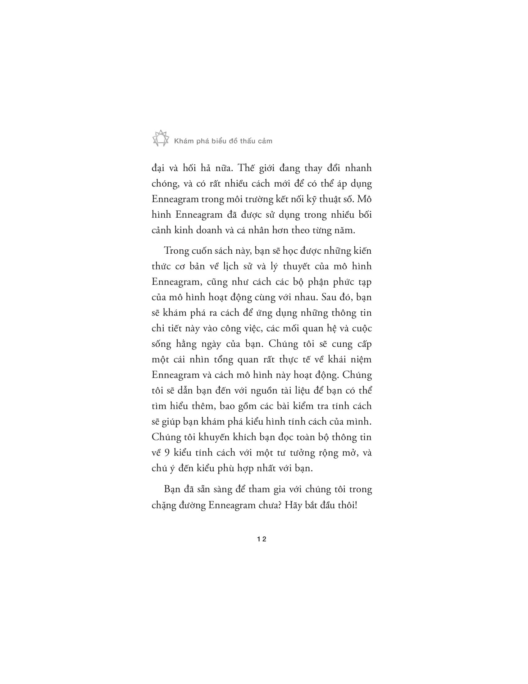 ‘Khám phá biểu đồ thấu cảm’ là cuốn sách giúp bạn hiểu sâu hơn về bản thân và từng bước tiến tới thành công trong cuộc sống. Cuốn sách khai thác mô hình Enneagram - mô hình tâm lý phổ biến, phân chia con người thành 9 kiểu hình tính cách khác nhau. Mỗi kiểu hình đại diện cho những đặc trưng và động lực riêng, giúp bạn nhận diện m.ình thuộc kiểu nào và cách mà nó ảnh hưởng đến thói quen, sự phát triển và tương tác của bạn trong công việc cũng như trong mối quan hệ.