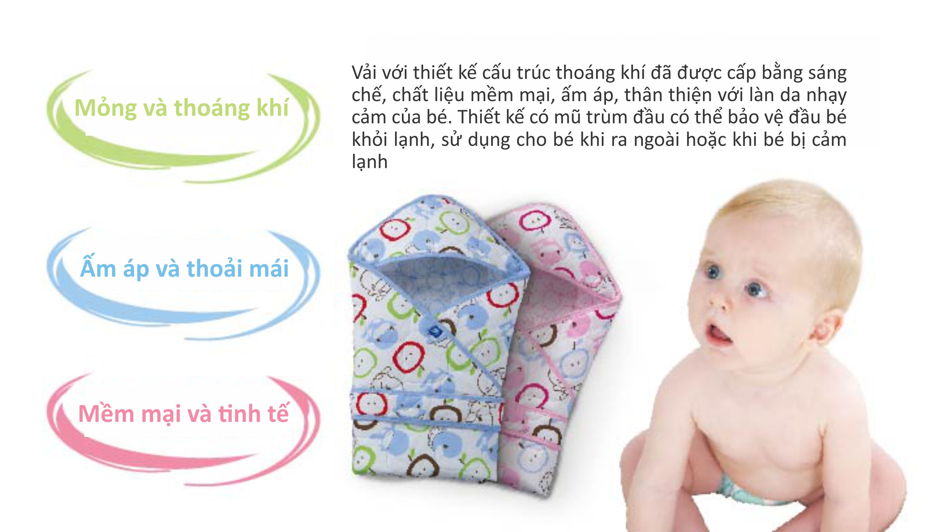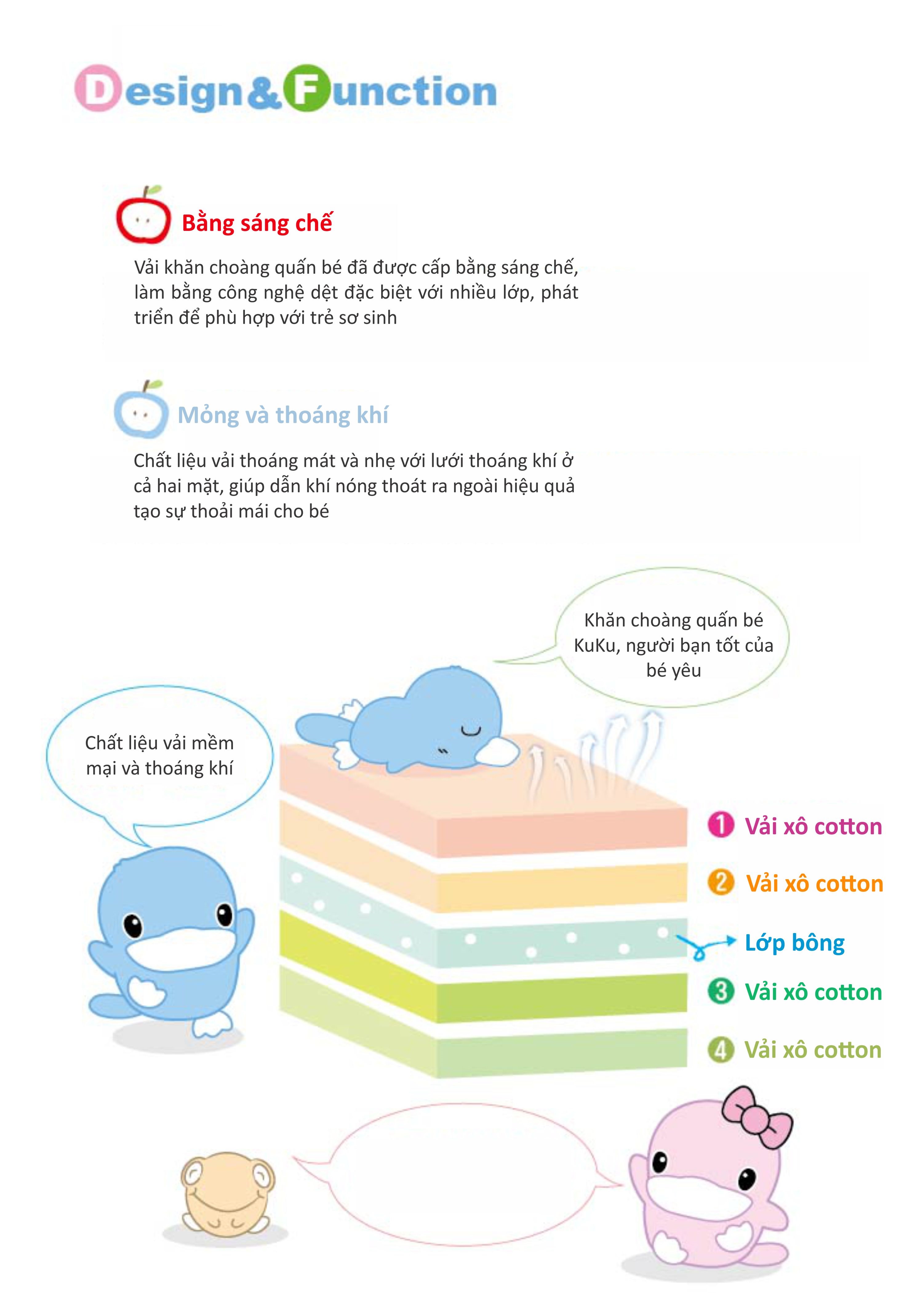 Họa tiết bông hoa được đính trên nền vải gấm khổ lớn ba lớp. Gạc ba mềm và nhẹ sử dụng sợi hữu cơ nhẹ nhàng quấn bé. Ngoài khả năng thoáng khí và hút nước