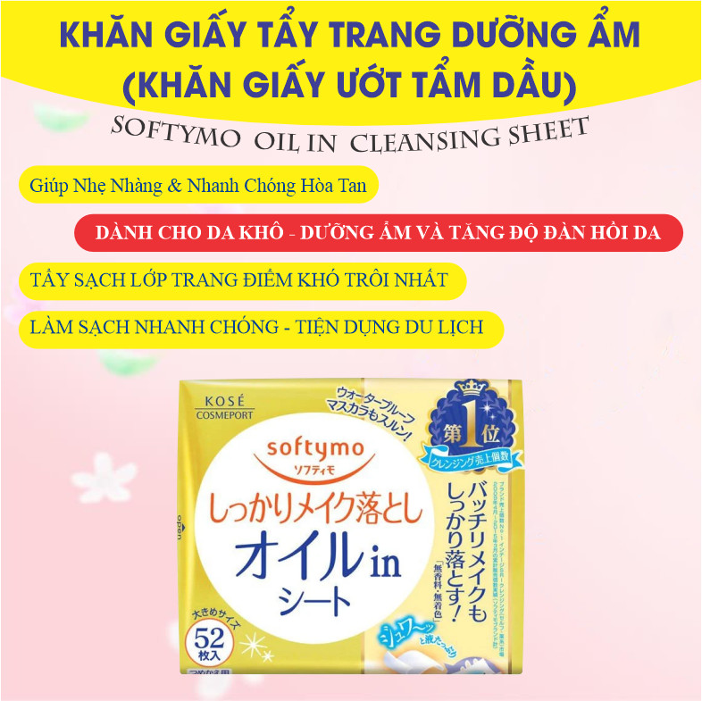 Khăn Giấy Tẩy Trang Dầu Giúp Sạch Sâu Kosé Softymo Oil in Cleansing Sheet (52 miếng) Xuất xứ : Nhật Bản Sản phẩm được làm bằng 100% vật liệu sợi tự nhiên cùng với các