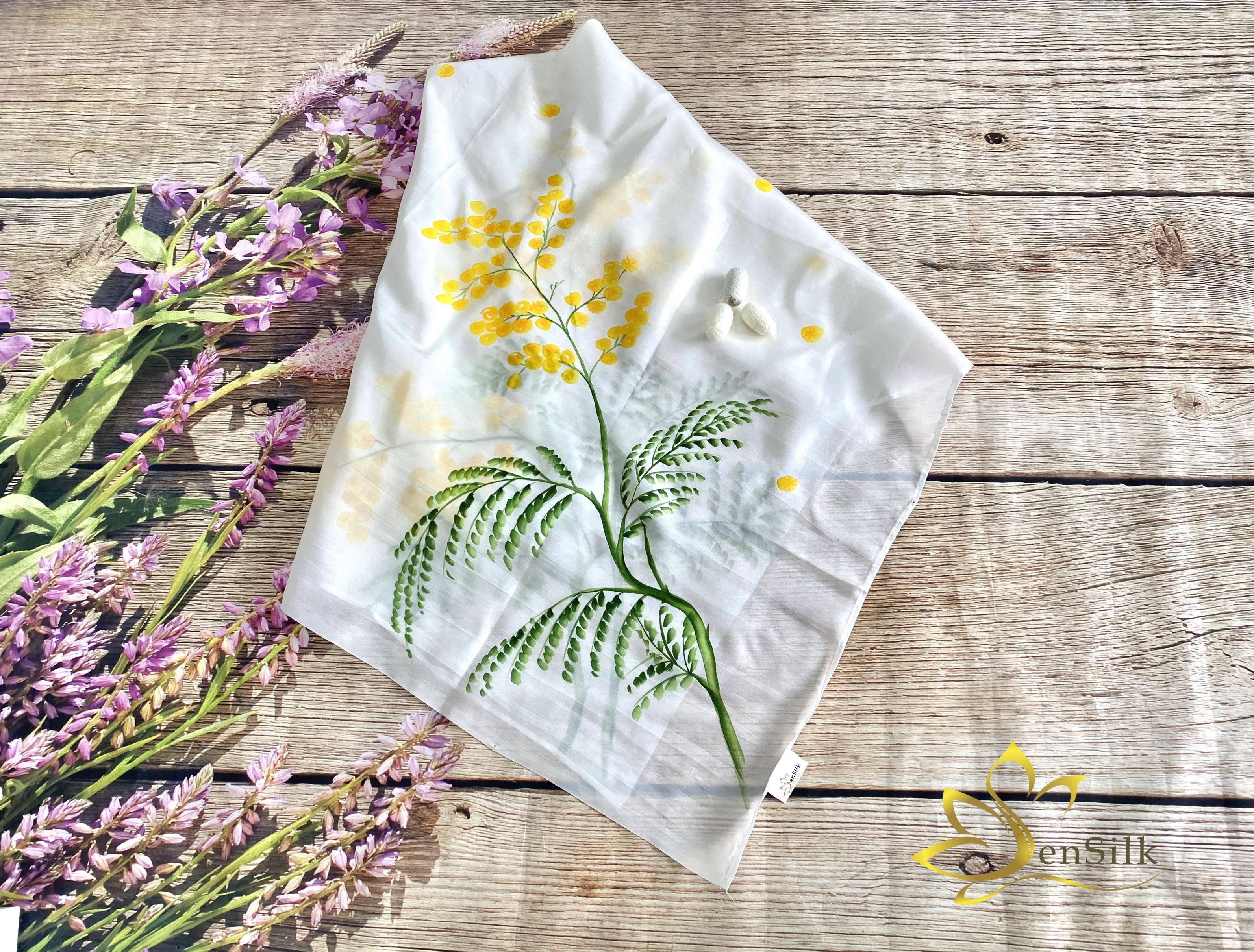 ✨Khăn Lụa Handmade Vẽ Hoa Mimosa SenSilk – Quà Kỷ Niệm Tình Yêu, Khăn Vuông Thời Trang 75*75