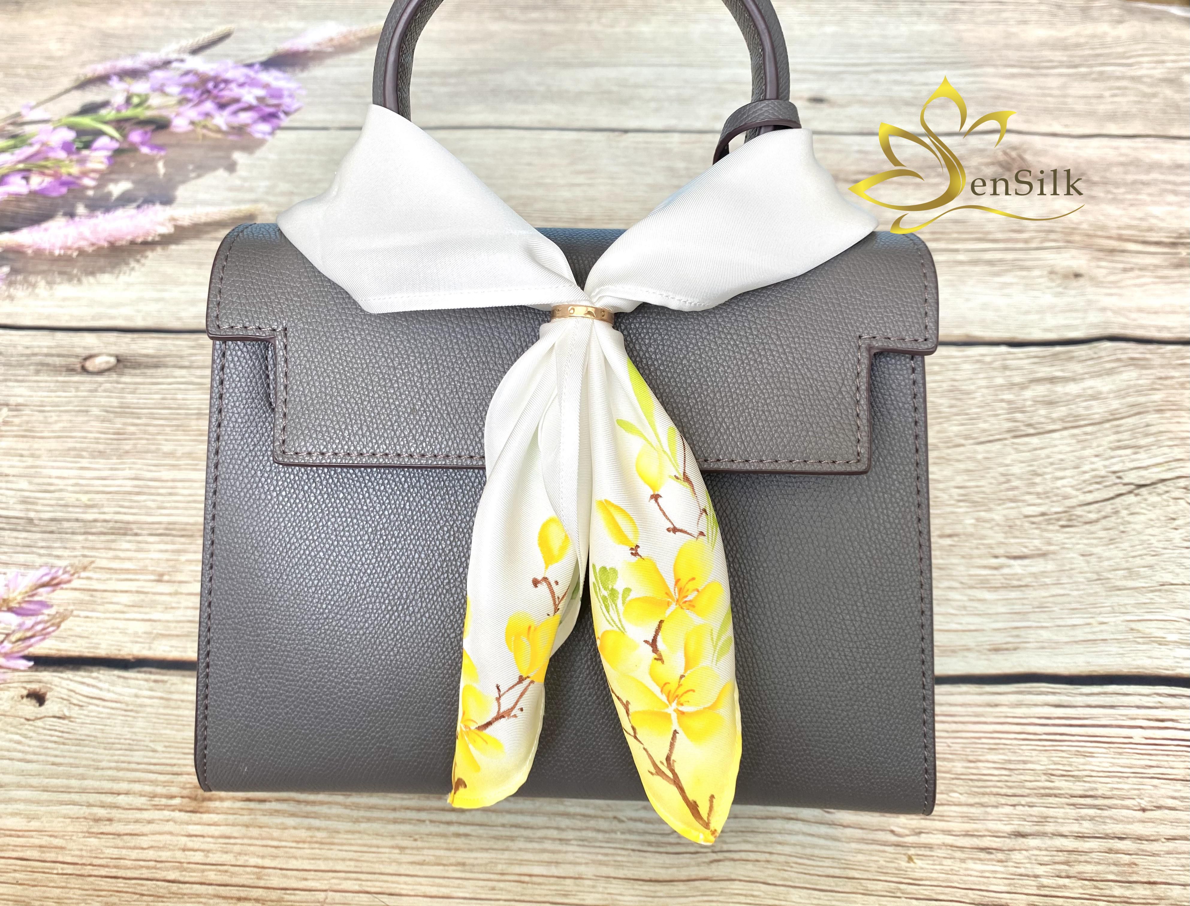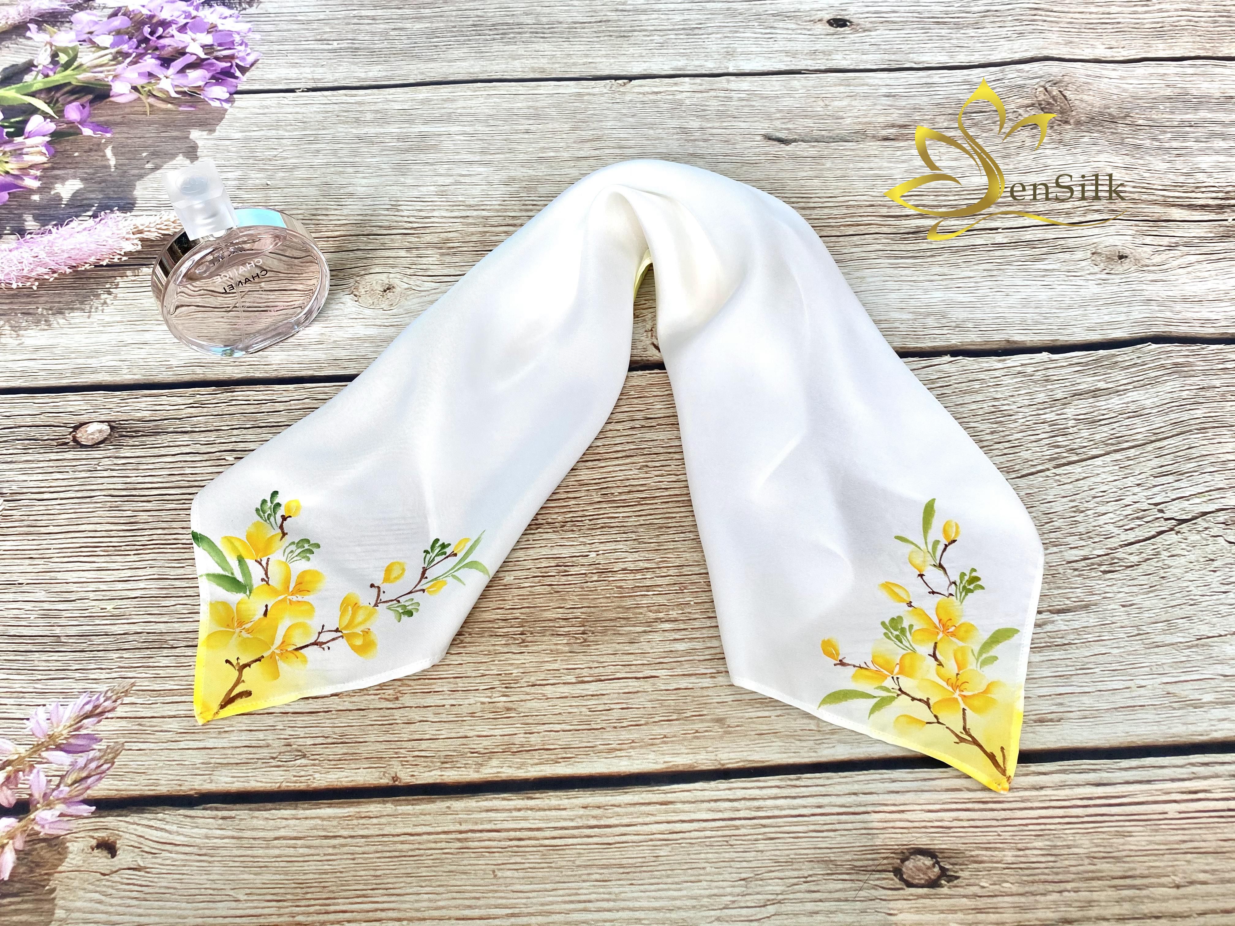 ✨Khăn Lụa Thắt Nơ Cổ Vẽ Tay Mai Vàng SenSilk 55x55cm, Lụa Tơ Tằm Bảo Lộc Thời Trang - Phụ Kiện Lụa Cao Cấp