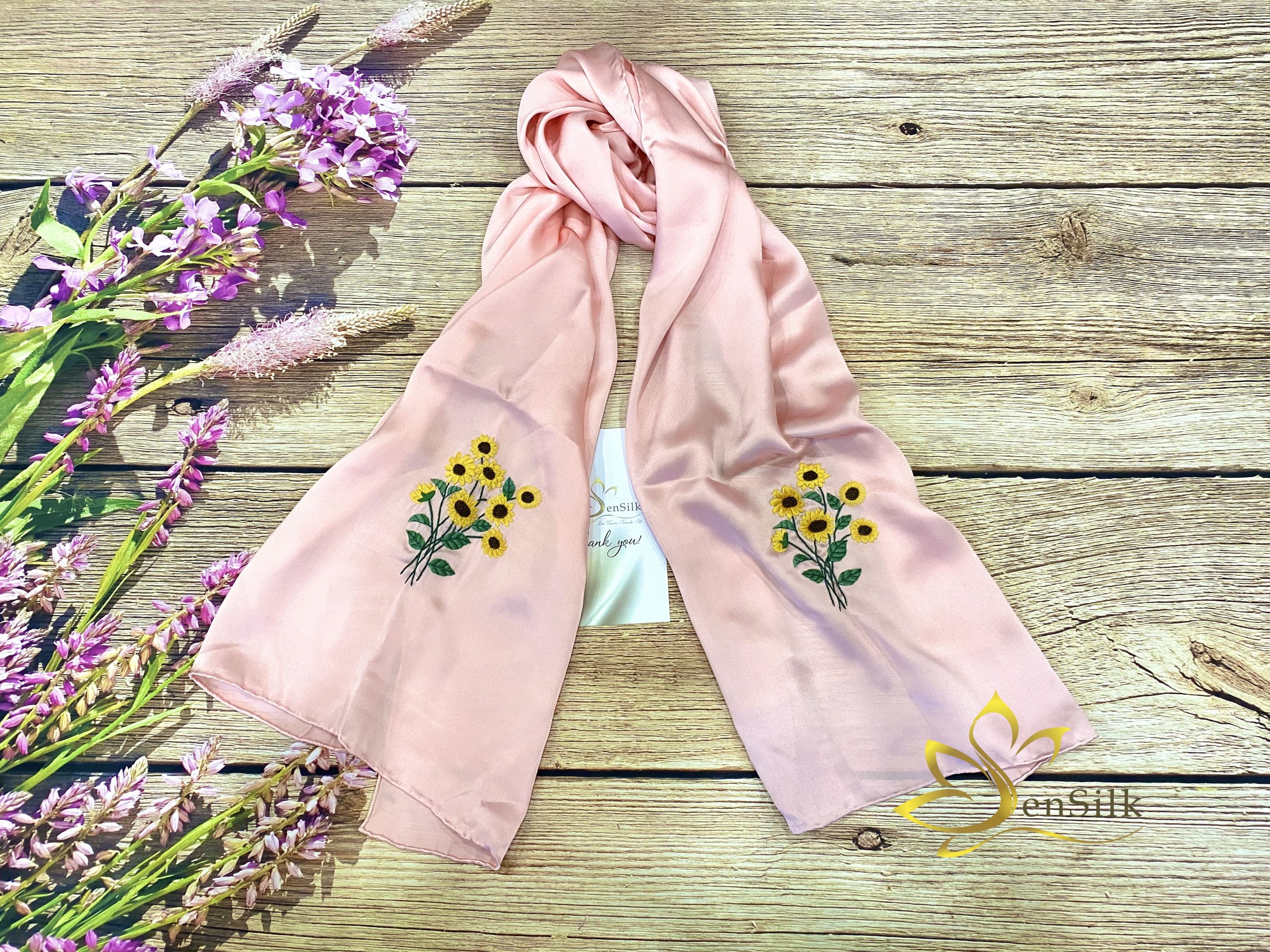 ✨Khăn Lụa Thêu Tay Hoa Hướng Dương 200x55cm, Silk Hand Embroidery made by SenSilk, Lụa Tơ Tằm Cao Cấp Thêu Thủ Công