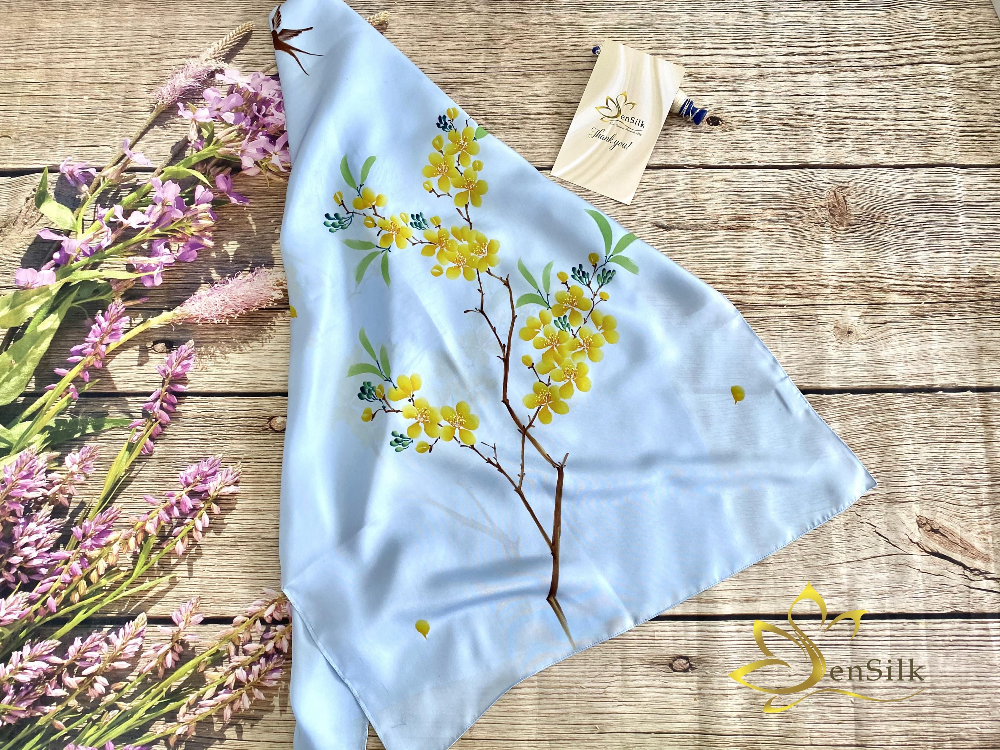 ✨Khăn Lụa Vẽ Tay SenSilk Limited Hoa Mai (Nude-Xanh - Hồng), Quà Tặng Đối Tác, Lụa Tơ Tằm Bảo Lộc 100% Silk made in Vietnam