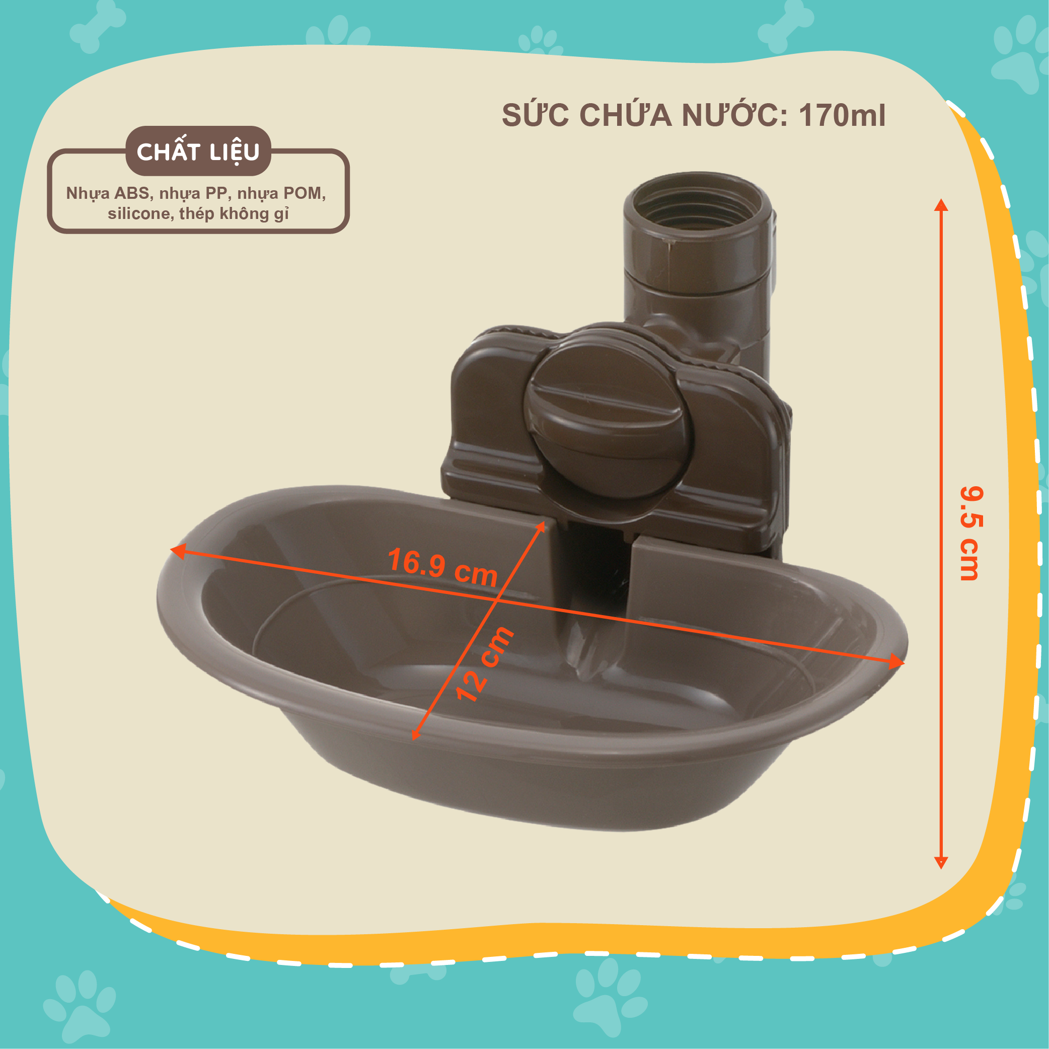Thông số kỹ thuật sản phẩm: Dung tích chứa nước: 170ml Kích thước khay: 16.9cm (dài) x 12cm (rộng) x 9.5cm (cao) Tương thích: Chai nhựa dung tích 500ml Chất liệu: Nhựa ABS, Nhựa PP, Nhựa POM, Silicone, Thép không gỉ Công dụng: Cho chó, mèo và thú cưng nuôi lồng khác   Khay đựng nước gắn chuồng cho thú cưng được thiết kế dễ dàng điều chỉnh độ cao, phù hợp với nhiều kích thước và giống loài khác nhau. Sản phẩm có thể cố định chắc chắn vào lồng hoặc chuồng, đảm bảo khay luôn vững vàng, không bị nghiêng đổ khi thú cưng sử dụng.   Bình nước tự động cho thú cưng với cơ chế cấp nước thông minh, giúp nước tự động chảy ra khi thú cưng uống vơi nước trong khay. Sản phẩm phù hợp cho chó, mèo và các loại thú nuôi trong lồng khác, giúp giữ vệ sinh và đảm bảo thú cưng luôn được cung cấp đủ nước sạch.   Sản phẩm có khay nước tháo rời, dễ dàng vệ sinh hằng ngày. Việc thay bình nước vô cùng đơn giản, tương thích với chai nhựa dung tích 500ml phổ biến. Giải pháp lý tưởng giúp người nuôi thú cưng tiết kiệm thời gian chăm sóc mà vẫn đảm bảo nước sạch luôn sẵn sàng.   Hướng dẫn sử dụng: Quy trình lắp đặt bình nước cho thú cưng rất đơn giản. Đầu tiên, bạn tháo rời các bộ phận gồm khay đựng nước, khớp nối và chốt gài. Sau đó, gắn phần giá đỡ bên ngoài lồng và cố định thanh giữ bên trong sao cho khớp chắc chắn. Tiếp theo, đặt khay đựng nước vào đúng vị trí cho đến khi nghe tiếng "cạch" để đảm bảo đã gắn chặt. Đổ nước vào chai nhựa (loại 500ml), gắn đầu nối, rồi lắp vào phần giá đỡ cho tới khi nghe tiếng khóa. Sản phẩm thiết kế thân thiện, tháo lắp dễ dàng, thuận tiện cho việc vệ sinh và thay nước hằng ngày.   Lưu ý khi sử dụng: Để đảm bảo nước chảy ra đều và ổn định, người dùng cần điều chỉnh độ nghiêng của chuồng hoặc khay cho cân bằng. Nếu khay bị nghiêng lên (hình A), nước sẽ không chảy ra; ngược lại nếu nghiêng xuống (hình B), nước sẽ chảy tràn quá mức. Cách khắc phục là điều chỉnh vị trí chuồng bằng cách kê cao một bên sao cho vạch trong khay song song với mặt nước – đây là trạng thái lý tưởng đảm bảo hoạt động bình thường. Việc căn chỉnh đúng sẽ giúp thú cưng luôn được cung cấp nước sạch mà không bị lãng phí.