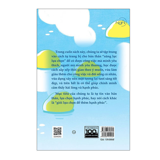 Trong cuốn sách này, chúng ta sẽ tập trung vào cách tự trang bị cho bản thân “năng lực lựa chọn” để có được công việc mà mình yêu thích, người mà mình yêu thương, học được cách sắp xếp thời gian theo ý muốn, vừa làm giàu thêm cho công việc và đời sống cá nhân, vừa dựng xây nên một tương lai tươi sáng tốt đẹp, và trên hết là, có thể giúp chính mình cảm thấy hài lòng và hạnh phúc.