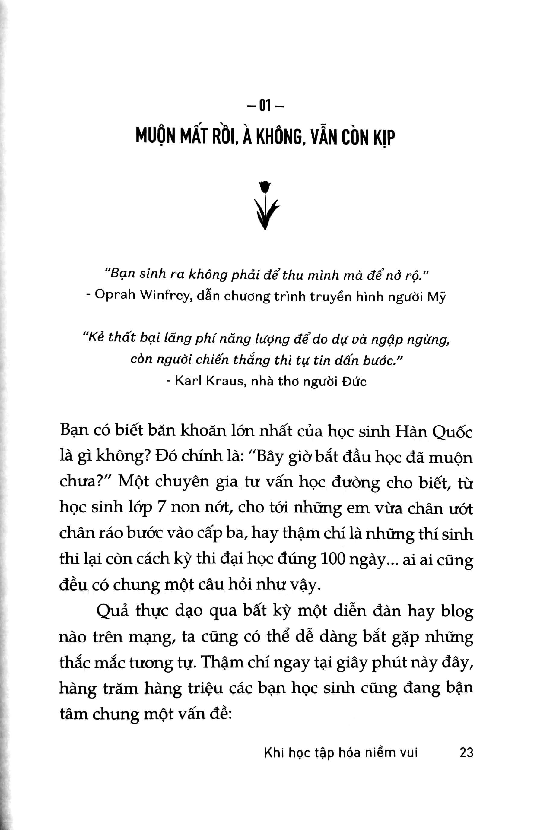 Ngồi vào bàn nhưng chẳng thể tập trung? Dù sắp tới kỳ thi nhưng vẫn khó lòng chấn chỉnh tỉnh thần? Biết tiếng Anh quan trọng nhưng không tìm nổi động lực học. Bạn thấy việc học nhằm chăn, phiền phức do mình không có điều kiện thuận lợi, không có hoàn cảnh phù hợp, không có môi trường yên tĩnh? Không đâu, hoàn toàn không phải vậy. Nguyên nhân thật sự khiến bạn không học nối chính là do chưa nắm rõ mục đích và ý nghĩa của việc học. Trong cuốn Khi học tập hỏa niềm vui, bằng trải nghiệm của bản thân, tác giả đã chỉ ra cho chúng ta một chân lý quý giá mà ít người biết đến: hiểu được vì sao mình cần học, ai cũng có thể tìm thấy niềm vui trong việc học và học một cách hiệu quả. Thay vì đưa ra một bí kíp học tập hay phương pháp luận vĩ đại, tác giả dùng câu chuyện của chính mình cũng như tấm gương của những người thành công trên toàn thế giới để hướng dẫn chúng ta cách rèn luyện ý chí tinh thần - bởi, chỉ có tinh thần bền bỉ, ý chí kiên cường, ta mới có thể học và học tốt. Bên cạnh những lời khuyên hữu ích về phương pháp học bằng toàn bộ tâm trí, 7 thói quen của người ham học hay cách giữ vững tinh thần trong lúc họ tác giả còn gửi đến các bạn độc giả - đặc biệt là các em thanh thiếu niên đang phải vật lộn với học hành thi cử - những lời động viên chân thành giúp bạn vững bước trên đường học dài lâu. Nào, đừng chần chừ gì nữa, hãy mở cuốn sách ra để tìm kiếm khoảnh khắc học tập hóa niềm vui trong chính bạn! Seonghyeok Park Sinh ra ở một vùng đất nông thôn với bốn bề là ruộng đồng, biển cả, xung quanh không có lấy một trung tâm dạy thêm, bản thân ông tới tận năm 15 tuổi vẫn không hề hứng thú với chuyện học hành. Tuy nhiên, nhờ vào một cơ duyên khiến ông bàng hoàng tỉnh ngộ, Seonghyeok Park đã hạ quyết tâm cao độ và kết quả là đồng thời đỗ cả 3 trường đại học: trường Luật Đại học Quốc gia Seoul, trường Kinh doanh Đại học Yonsei và trường Y học cổ truyền Đại học Dongshin. Sau khi tự trải nghiệm và gặt hái được thành công, ông cảm thấy mình có sứ mệnh phải giúp đỡ những người khác cũng đang loay hoay tìm cách tiến lên – đặc biệt là thế hệ thanh thiếu niên - hiện thực hóa ước mơ của mình. Chính vì vậy, ông đã miệt mài nghiên cứu suốt 8 năm ròng rã để cho ra đời cuốn sách Khi học tập hóa niềm vui.