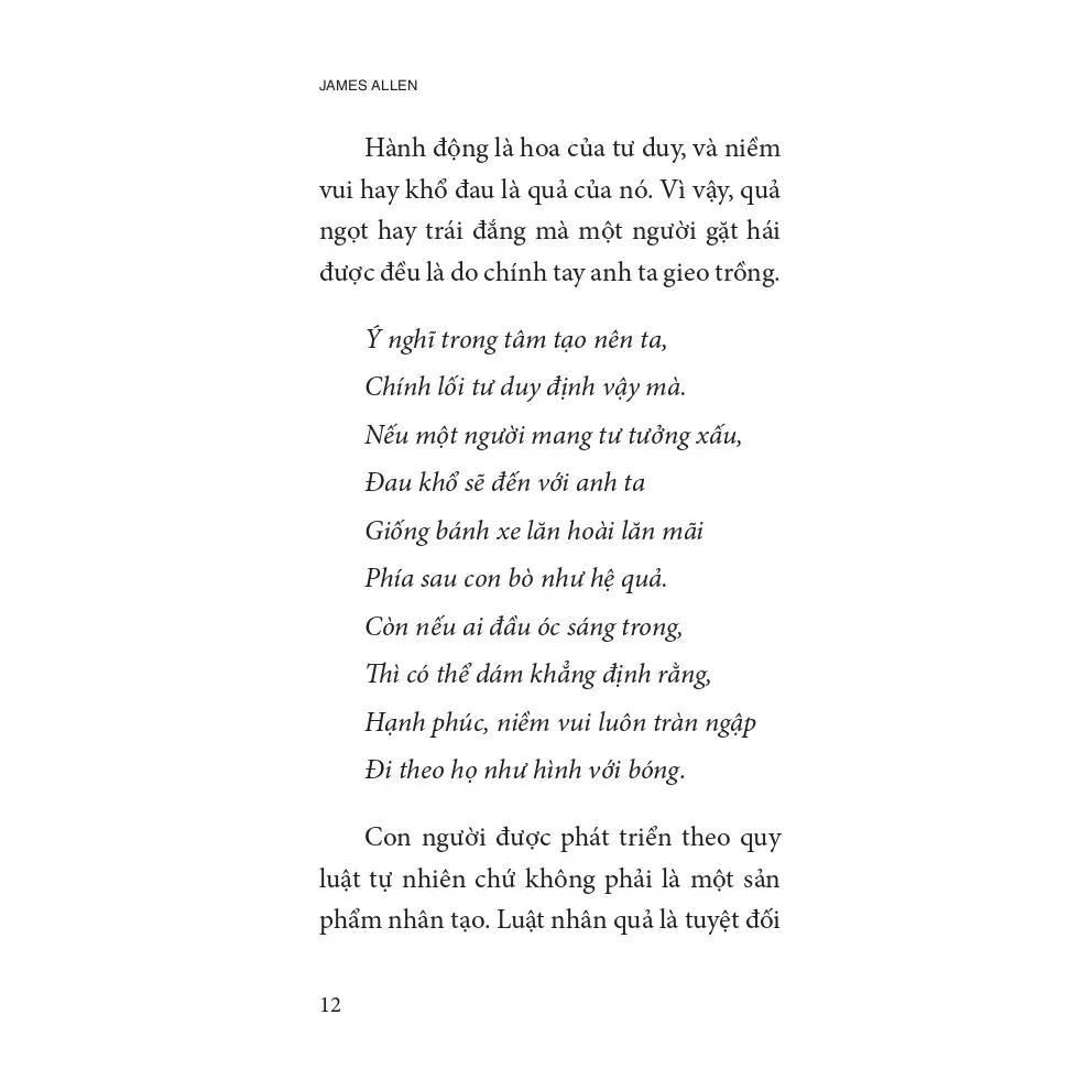 James Allen mô tả cuốn sách đề cập đến sức mạnh của tư duy, và đặc biệt là việc áp dụng tư duy để đạt được hạnh phúc. Ông không đưa ra lý thuyết phức tạp, mà viết bằng trái tim và sự trải nghiệm – để bạn hiểu một cách đơn giản rằng: “Bạn chính là kết quả của những gì bạn nghĩ.”
