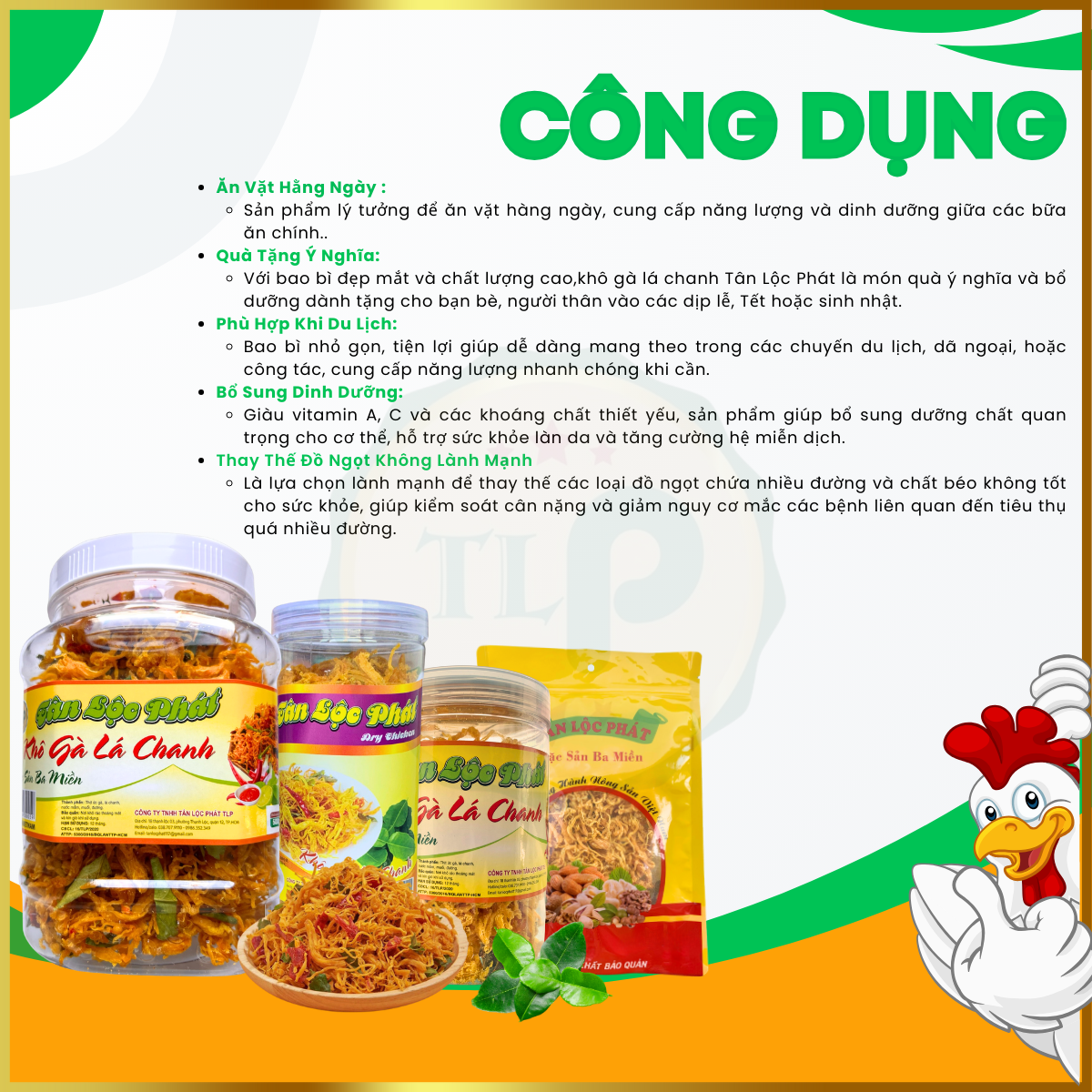 Xuất xứ: Việt Nam. HSD: in trên bao bì Quy cách: Bịch zip 500G. Combo 1 kg gồm 2 bịch. Thương Hiệu: TLP     - Khô gà xé lá chanh thơm ngon,