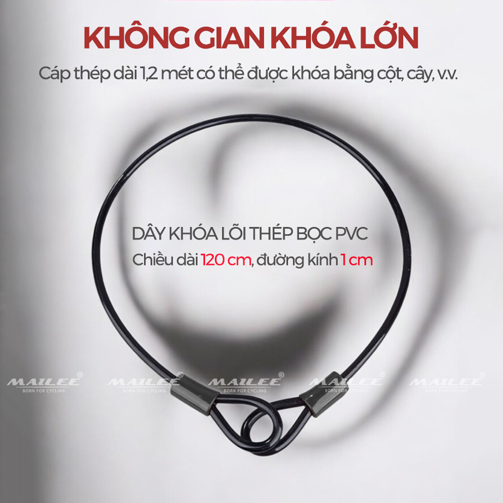 - Được chế tạo từ hợp kim thép bền bỉ với vỏ PVC chắc chắn, sản phẩm tích hợp khóa 4 mã số tiện lợi và cáp thép 1m2 (tùy chọn) linh hoạt, bảo vệ xe đạp, xe điện hay xe địa hình an toàn tuyệt đối.