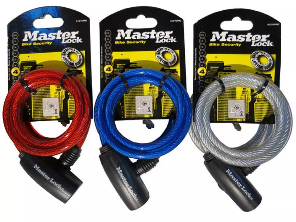 KHÓA DÂY XE ĐẠP MASTERLOCK 8126EURD Dây cáp dài 1.8m, chất liệu thép cuộn bọc Vinyl. Một màu đen Đường kính dây 8mm Gồm 02 chìa Ứng dụng khóa xe đạp