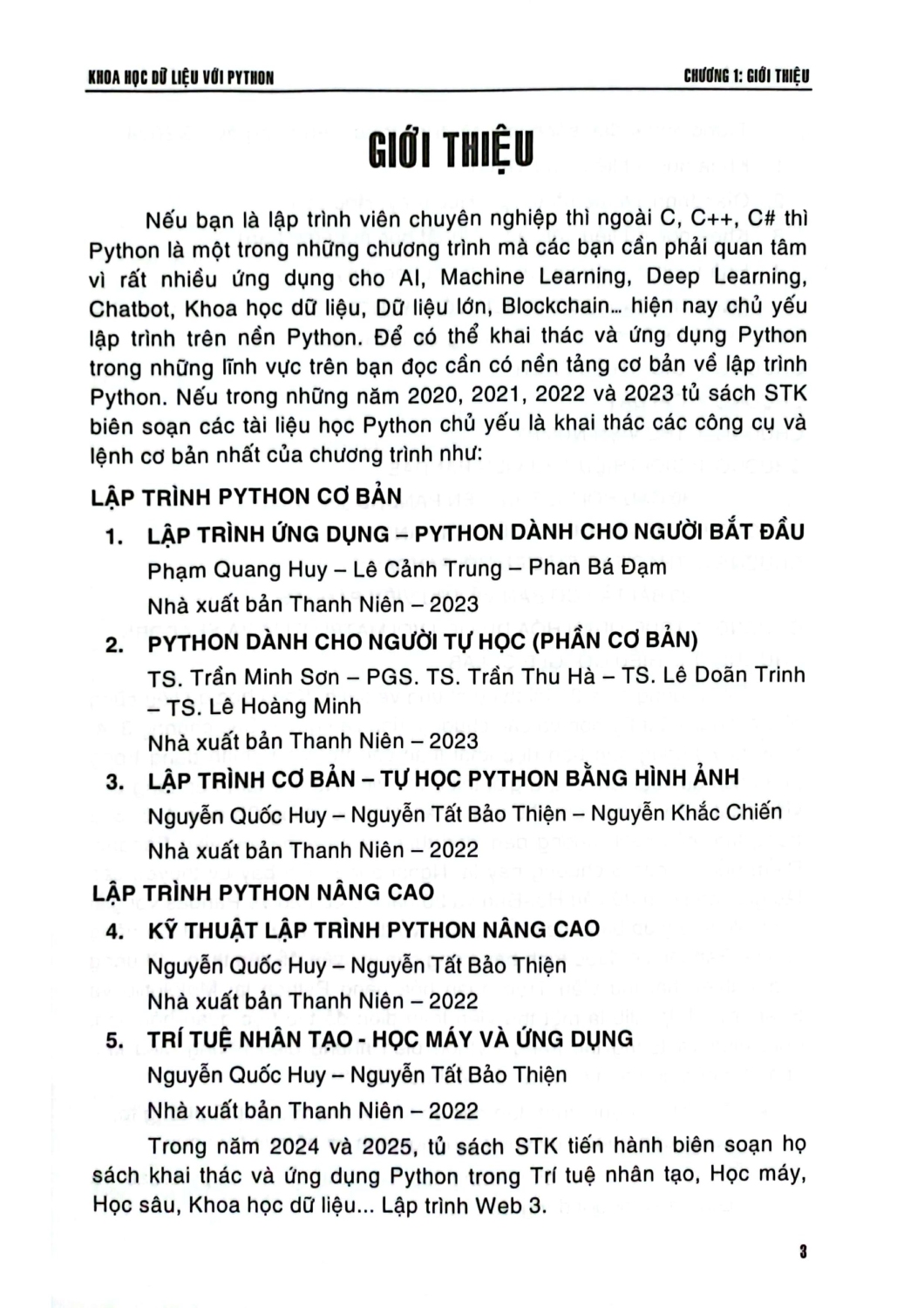 Mua tại TiktokKhoa Học Dữ Liệu Với Python Sách Khoa học dữ liệu với Python được trình bày với 424 trang khổ 16 x 24 cm qua 7 chương và 1 phụ lục: Chương 1: Giới thiệu sách. Chương 2: Cài đặt. Chương 3: Thư viện Numpy. Chương 4: Giới thiệu thư viện Pandas - 30 câu hỏi về Pandas. Chương 5: Đọc và ghi dữ liệu với Pandas. Chương 6: Thao tác dữ liệu với Pandas - 20 bài tập cơ bản về Pandas. Chương 7: Trực quan hóa dữ liệu với Matplotlib và Seaborn. Phụ lục: Giới thiệu Google Colab Sách giới thiệu nhanh về các thư viện chính dùng nhiều trong phân tích dữ liệu, học máy, học sâu, các thành phần thiết yếu của ngôn ngữ Python dành cho các nhà nghiên cứu phân tích dữ liệu và nhà phát triển học máy và học sâu. Nền tảng phân tích dữ liệu được trình bày bởi chuyên gia. Toàn bộ vòng đời phát triển phân tích dữ liệu có thể giải thích và các phương pháp tiên tiến hướng đến sự đơn giản, khả năng mở rộng, tái sử dụng, nhân rộng, triển khai nhanh và bảo trì dễ dàng. Từ làm sạch dữ liệu đến thiết kế mô hình, thử nghiệm và lựa chọn tính năng, cho đến những hình ảnh trực quan tuyệt vời dễ dàng cho các bên liên quan và người ra quyết định. Chương 1 và 2 giới thiệu chung về sách, Khoa học dữ liệu cũng như cách cài đặt Python và các chương trình liên quan. Các chương 3, 4, 5, 6 và 7 hướng dẫn bạn đọc khai thác các thư viện chính dùng trong phân tích dữ liệu. Chương 3 giới thiệu thư viện Numpy làm nền tảng cho việc phát triển và học các thư viện khác. Các nội dung Chương 4, 5, 6 là trọng tâm của sách hướng dẫn khai thác và sử dụng thư viện Pandas. Điểm nổi bật của 3 chương này là: Ngoài phần trình bày Lý thuyết, các tác giả còn soạn 30 câu Hỏi-Đáp và 20 bài tập cơ bản về Pandas với giải thích rõ ràng giúp bạn đọc hiểu rõ hơn về thư viện này. Các bài tập nâng cao về Pandas sẽ được trình bày trong các chuyên đề tiếp theo. Chương 7 giới thiệu hai thư viện Trực quan hóa bằng Python là: Matplotlib và Seaborn. Matplotlib là một thư viện toàn diện để tạo trực quan hóa tĩnh, hoạt hình và tương tác trong Python. Matplotlib biến những điều những điều khó khăn trở nên dễ dàng hơn và có thể thực hiện được. Seaborn là thư viện trực quan hóa dữ liệu Python dựa trên Matplotlib. Nó cung cấp một giao diện cấp cao để vẽ đồ họa thống kê hấp dẫn và giàu thông tin. Và cuối cùng Phụ lục giới thiệu Google Colab, là một nền tảng trực tuyến miễn phí hỗ trợ người dùng phát triển và chạy mã bằng Python. Nền tảng này cung cấp một môi trường để phân tích dữ liệu, nghiên cứu AI và Machine Learning… Cuốn sách này được viết dành cho các nhà phân tích dữ liệu chuyên nghiệp muốn biết cách xây dựng các ứng dụng đáng tin cậy và chính xác trong Python. Đây không phải là sách giáo khoa về phân tích dữ liệu, học máy, học sâu, người học cần nắm được những khái niệm cơ bản về học máy học sâu để hiểu rõ hơn những nội dung trình bày trong sách.