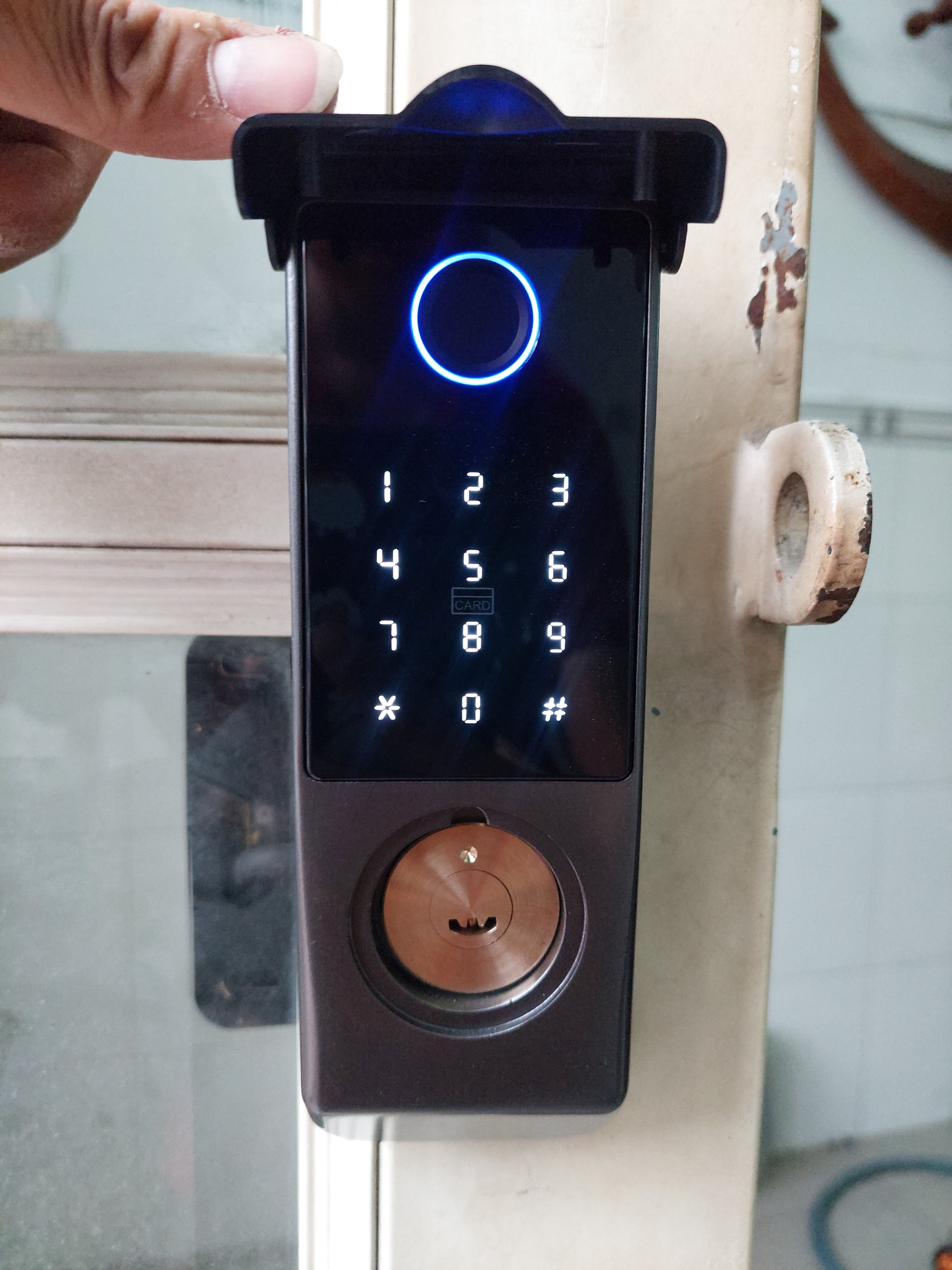 - Mặt khóa ngoài (mặt có số, có gắn ổ chìa chỗ vòng tròn đen) dùng để mở bằng vân tay, mật mã, thẻ, chìa cơ.