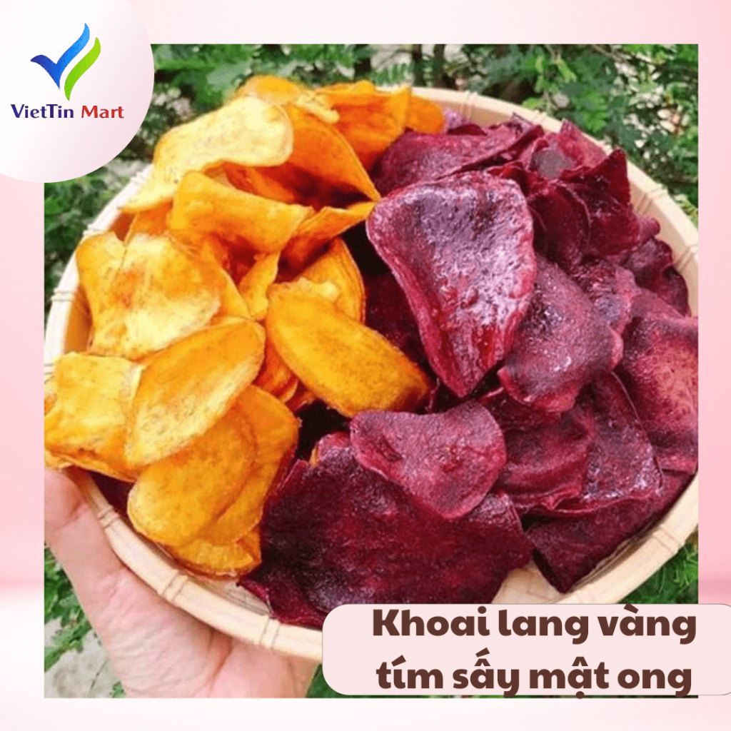 THÔNG TIN SẢN PHẨM Tên sản phẩm: 1,5KG KHOAI LANG VÀNG + TÍM SẤY mật ong Thành phần: Khoai Lang Vàng, khoai lang tím, Dầu Thực Vật, Đường, Muối Thương hiệu: VIETTINMART Khối lượng: 1.5kg