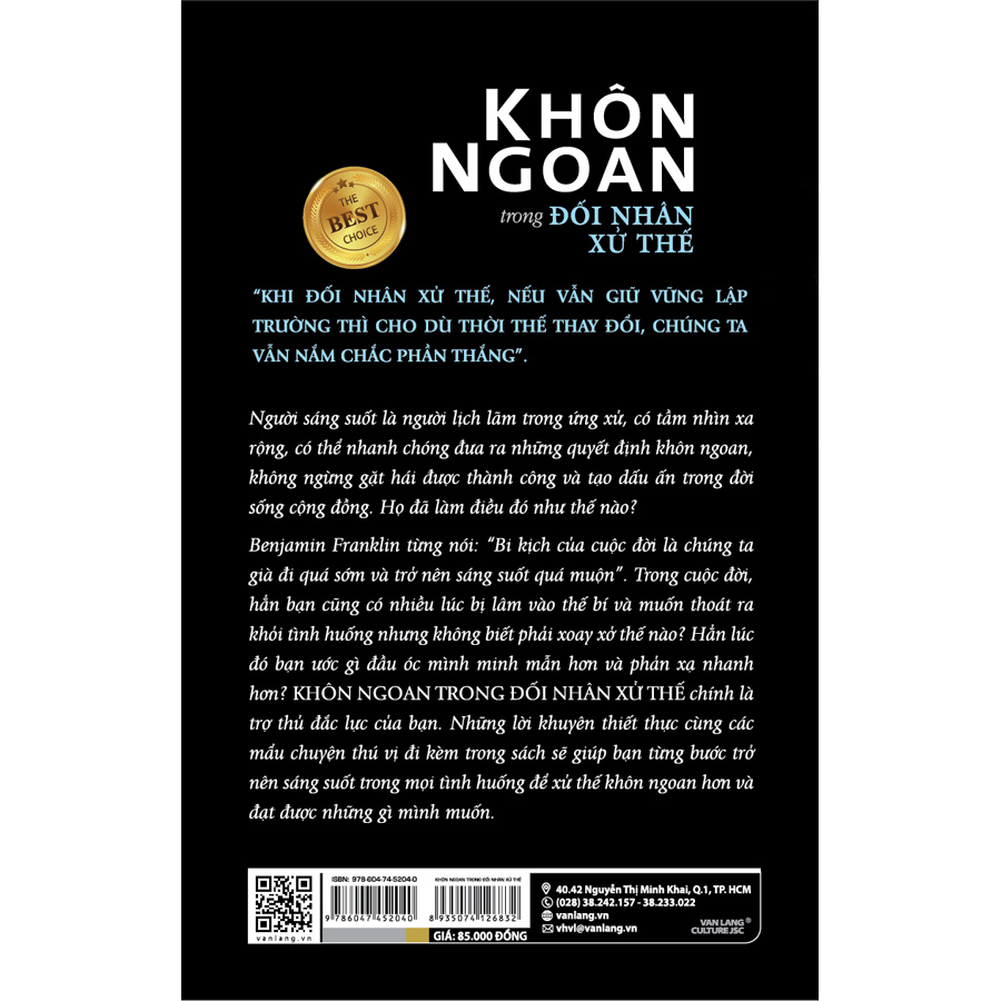 Benjamin Franklin từng nói: “Bi kịch của cuộc đời là chúng ta già đi quá sớm và trở nên sáng suốt quá muộn”. Trong cuộc đời, hẳn bạn cũng có nhiều lúc bị lâm vào thế bí và muốn thoát ra khỏi tình huống nhưng không biết phải xoay xở thế nào? Hẳn lúc đó bạn ước gì đầu óc mình minh mẫn hơn và phản xạ nhanh hơn? KHÔN NGOAN TRONG ĐỐI NHÂN XỬ THẾ chính là trợ thủ đắc lực của bạn. Những lời khuyên thiết thực cùng các mẩu chuyện thú vị đi kèm trong sách sẽ giúp bạn từng bước trở nên sáng suốt trong mọi tình huống để xử thế khôn ngoan hơn và đạt được những gì mình muốn.