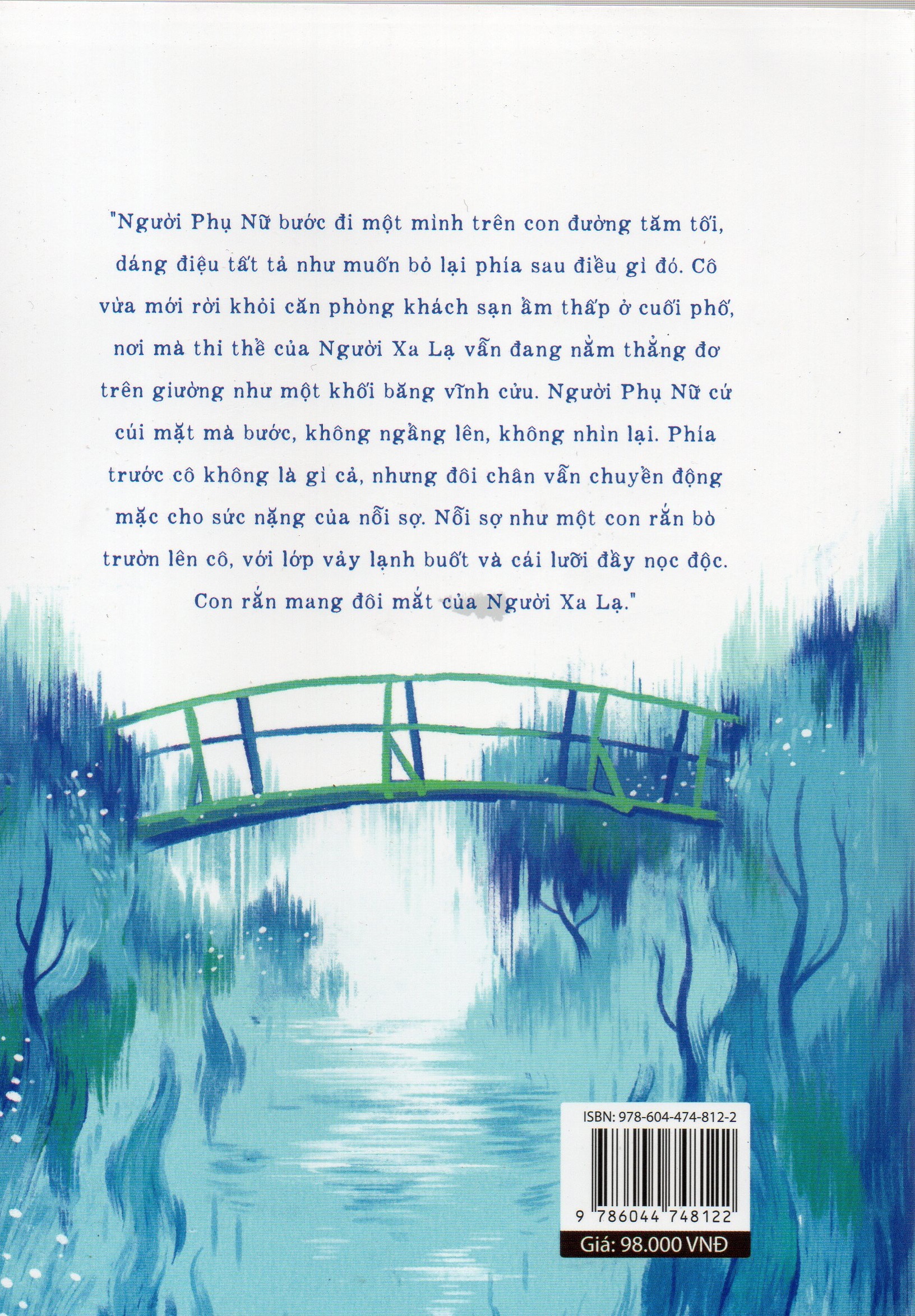 " Người Phụ Nữ bước đi một mình trên con đường tăm tối, dáng điệu tất tả như muốn bỏ lại phía sau điều gì đó. Cô vừa mới rời khỏi căn phòng khách sạn ẩm thấp ở cuối phố , nơi mà thi thể của Người Xa Lạ vẫn đang nằm thẳng đơ trên giường như một khối băng vĩnh cửu. Người Phụ Nữ cứ cúi mặt àm bước, không ngẩng lên, không nhìn lại. Phía trước cô không là gì cả, nhưng đôi chân vẫn chuyển động mặc cho sức nặng của nỗi sợ. Nỗi sợ như một con rắn bò trườn lên cô, với lớp vảy lạnh buốt và cái lưỡi đầy nọc độc. Con rắn mang đôi mắt của Người Xa Lạ"
