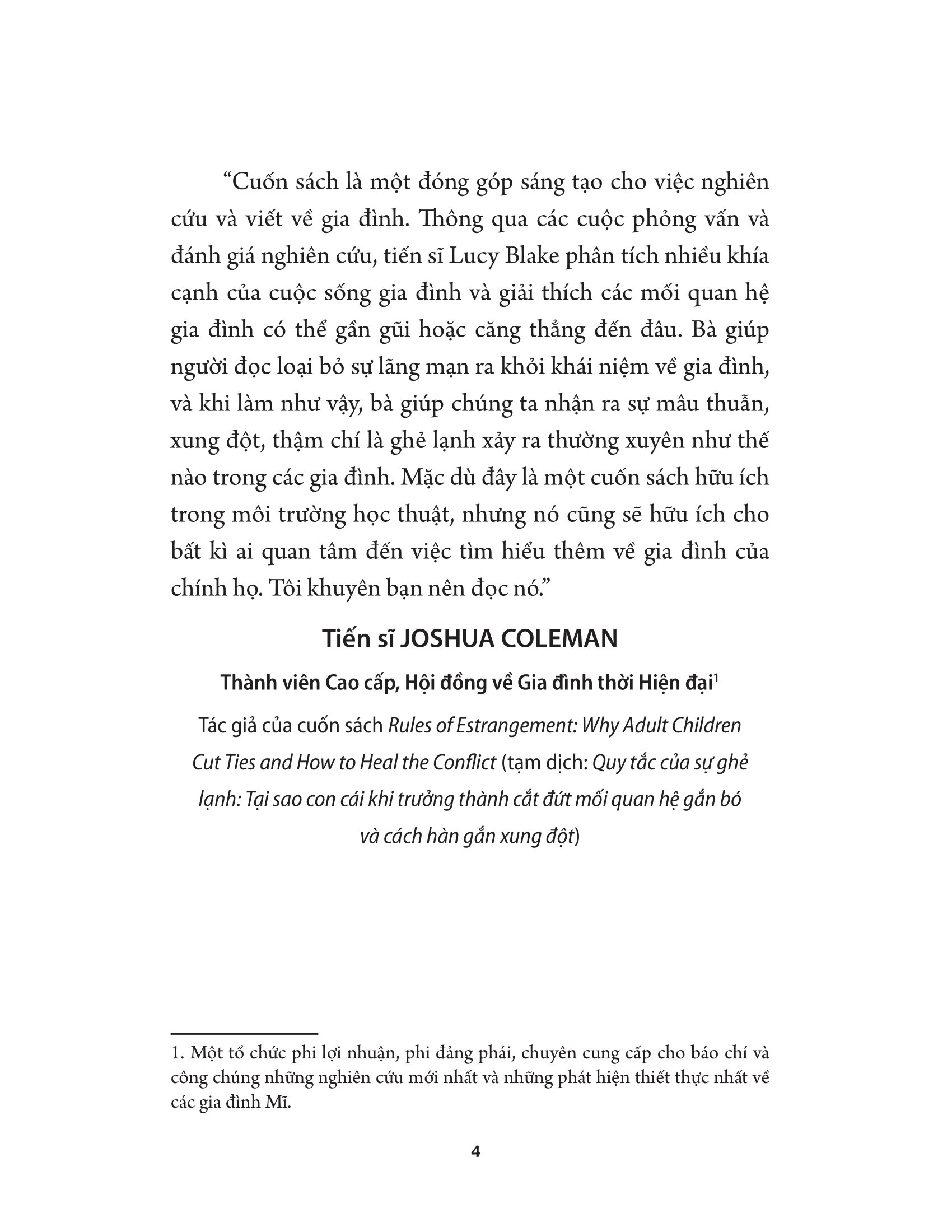Không Gia Đình Nào Hoàn Hảo Bạn định nghĩa gia đình là gì? Gia đình là nơi ẩn náu khỏi những thăng trầm của cuộc sống hằng ngày. Gia đình giống như một tấm lưới an toàn, chở che và bảo vệ. Gia đình là yêu thương. Và không giống như bất kì tình yêu thương nào khác, đó là tình yêu thương vô điều kiện. Cho dù có làm gì hay nói gì, bạn cũng không thể tìm được lời giải thích xác đáng cho tình yêu thương giữa các thành viên trong gia đình. Nhưng thực tế là Không Gia Đình Nào Hoàn Hảo vì gia đình nào cũng có những mâu thuẫn, xung đột và bất đồng. Bạn sẽ rất ngạc nhiên rằng có rất nhiều người như bạn. Không Gia Đình Nào Hoàn Hảo. Chỉ khi CHẤP NHẬN sự thật đó, dám nói ra và đối mặt với nó thì chúng ta mới được giải phóng khỏi nỗi đau khổ âm thầm của mình, tích cực tìm kiếm các giải pháp và sự giúp đỡ để cải thiện hoàn cảnh. Như vậy chúng ta mới có thể sống và phát triển trong một môi trường gia đình hạnh phúc thực sự. Bạn học được gì từ cuốn sách Không Gia Đình Nào Hoàn Hảo? Cuốn sách Không Gia Đình Nào Hoàn Hảo sẽ giúp bạn loại bỏ cảm giác lo âu, sự hoài nghi. Khắc phục cả việc lí tưởng hóa lẫn tiêu cực hóa, cuốn sách sẽ thay đổi cách chúng ta nghĩ và viết về gia đình. Đây là cuốn sách hữu ích cho bất kì ai quan tâm đến việc tìm hiểu thêm về gia đình của chính họ.