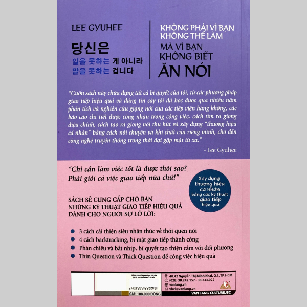 “Cuốn sách này chứa đựng tất cả bí quyết của tôi, từ các phương pháp giao tiếp hiệu quả và đáng tin cậy tôi đã học được qua nhiều năm phân tích và nghiên cứu giọng nói của các tiếp viên hàng không, các báo cáo chi tiết được công nhận trong công việc, cách tìm ra giọng điệu chính, cách tạo ra giọng nói thu hút và xây dựng “thương hiệu cá nhân” bằng cách nói chuyện và khí chất của riêng mình, cho đến công nghệ truyền thông trong thời đại gặp mặt từ xa.” - Lee Gyuhee