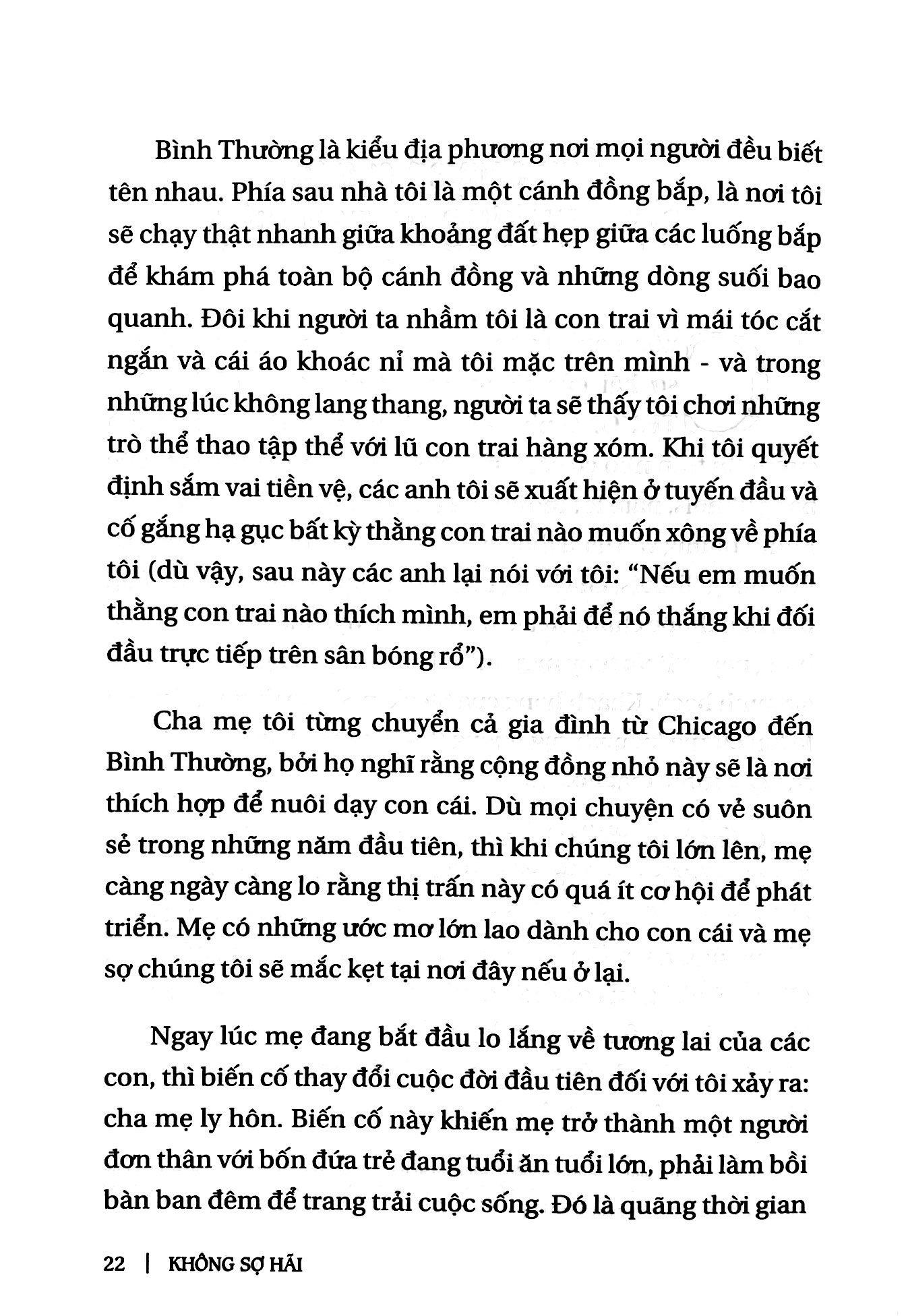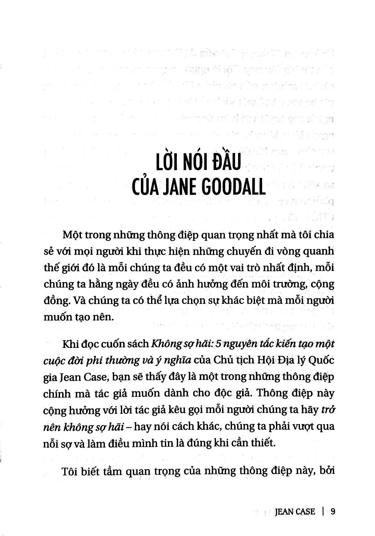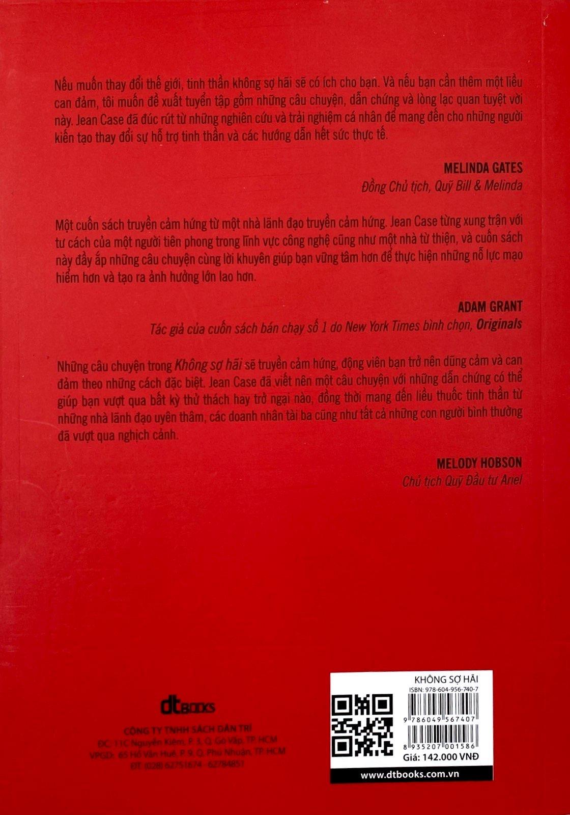 Không sợ hãi là lời kêu gọi hành động cho những người muốn tìm kiếm, xây dựng một cuộc sống phi thường và mang đến sự thay đổi lớn lao. Khi Chủ tịch Hội Địa lý quốc gia Mỹ Jean Case quyết định nghiên cứu các giá trị cốt lõi của những nhà kiến tạo vĩ đại, trong quá khứ cũng như hiện tại, từ những nhà sáng chế đến những nhà cách mạng, bà tìm thấy 5 đặc điểm chung đáng ngạc nhiên. Họ không phải là những giàu có, có đặc quyền hay thậm chí là không phải là thiên tài, mà họ là những người khác biệt dám “cược lớn”, can đảm chấp nhận mạo hiểm, biến thất bại thành những bài học ý nghĩa, không ngại vươn xa và để cho sự cấp bách chinh phục nỗi sợ hãi. Trong cuốn sách Không sợ hãi, Jean Case khắc họa rõ nét 5 nguyên tắc này thông qua nhiều câu chuyện sống động – từ kinh nghiệm chuyển đổi của cá nhân bà, tới câu chuyện ấn tượng của Jane Goodall Tiến sĩ, Hiệp sĩ Hoàng gia Anh trong việc thấu hiểu và bảo vệ loài tinh tinh, quyết định của đầu bếp nổi tiếng José André trên con đường trở thành “người phản ứng đầu tiên” và đưa nhà bếp của anh đến những nơi bị bão tàn phá để chăm sóc những người bị đói, cho tới nỗ lực đầy tham vọng của Bryan Stevenson – luật sư, nhà hoạt động xã hội – nhằm chấm dứt tình trạng bất bình đẳng, và nhiều câu chuyện khác nữa…. Bà chia sẻ các góc nhìn mới mẻ sâu sắc cùng những câu chuyện mà có thể bạn đọc từng biết tới – như câu chuyện của AirBnB khởi đầu từ con số không trở thành ngành công nghiệp khách sạn, hay quyết định chinh phục Mặt trăng của nhân vật làm nên lịch sử - Tổng thống John F. Kennedy, và nhiều viên ngọc quý từ những người kiến tạo sự thay đổi mà bạn chưa từng nghe nói. Bằng cách kết hợp các câu chuyện, những lời khuyên thực tế và truyền cảm hứng, Không sợ hãi chỉ cho bạn đọc cách áp dụng thành công 5 nguyên tắc không sợ hãi vào đời sống, từ đó châm ngòi cho những ý tưởng đột phá góp phần thay đổi thế giới chúng ta đang sống theo cách tốt đẹp hơn: Dám cược lớn. Có rất nhiều người, nhiều tổ chức có tính cẩn trọng tự nhiên. Họ thường xem cách nào đã có tác dụng trong quá khứ rồi cố gắng lặp lại cách làm đó, nhưng chỉ dẫn tới sự gia tăng về lượng. Mọi biến đổi làm nên lịch sử thật sự chỉ xảy ra khi người ta quyết định thực hiện những thay đổi có tính cách mạng. Can đảm chấp nhận mạo hiểm. Hãy dám thử những điều mới mẻ, chưa ai từng trải qua và tiếp tục thử nghiệm. Chấp nhận mạo hiểm không giống như nhắm mắt lại để nhảy qua vực sâu mà là một quá trình dài để thử và sai. Biến thất bại thành những bài học ý nghĩa. Những thành tựu gia vĩ đại coi thất bại là phần cần thiết của cuộc hành trình đi tới thành công. Người ta không tìm kiếm thất bại, nhưng khi thất bại xảy ra, những nhà đổi mới vĩ đại sẽ tìm kiếm ý nghĩa đằng sau cú vấp ngã đó, phát huy bài học họ rút ra được và chia sẻ kinh nghiệm cùng người khác. Vượt khỏi vùng an toàn. Xã hội chúng ta luôn chìm đắm trong những huyền thoại về các thiên tài đơn độc. Nhưng sự đổi mới xảy ra nhờ có sự giao lưu. Việc xây dựng các mối quan hệ tốt đẹp với mọi người xung quanh, nhất là những người có kinh nghiệm đa dạng sẽ tạo nên những sự vươn xa đầy bất ngờ cho chính người trong cuộc. Để sự cấp bách chinh phục nỗi sợ hãi. Đừng nghĩ quá nhiều mà cũng đừng phân tích quá độ. Mong muốn tìm hiểu một vấn đề từ mọi góc độ là hết sức tự nhiên, nhưng tìm hiểu quá mức có thể khiến cho nỗi sợ làm bạn tê liệt. Hãy để cho nhu cầu khẩn thiết xử lý mọi hoài nghi và tư tưởng thoái lui. Điều đơn giản bạn cần nghĩ đến là hãy làm thôi. Năm nguyên tắc này có thể được tóm gọn trong cụm từ: Không sợ hãi. Khi tập hợp cùng nhau, năm nguyên tắc này sẽ tạo thành một lộ trình kiến tạo thay đổi cho mọi người, từ mọi lĩnh vực trong cuộc sống, nhưng có một điều quan trọng bạn cần nhớ, rằng đây không phải là “quy luật”. Hãy nghĩ những nguyên tắc này là một bộ tiêu chuẩn có thể giúp chúng ta nhận biết khi nào thì những quyết định được hình thành trên tinh thần không sợ hãi.