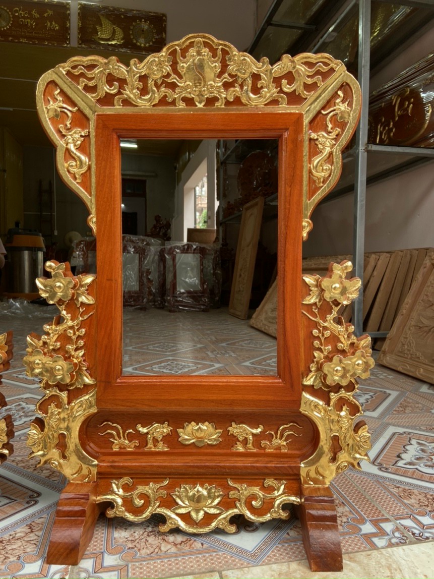 _ Khung ảnh thờ cúng khung viền trạm khắc cành hoa mai được làm bằng chất liệu gỗ gõ đỏ tự nhiên 100% ,Và sơn pu dát vàng cao cấp _ Kích thước khung viền
