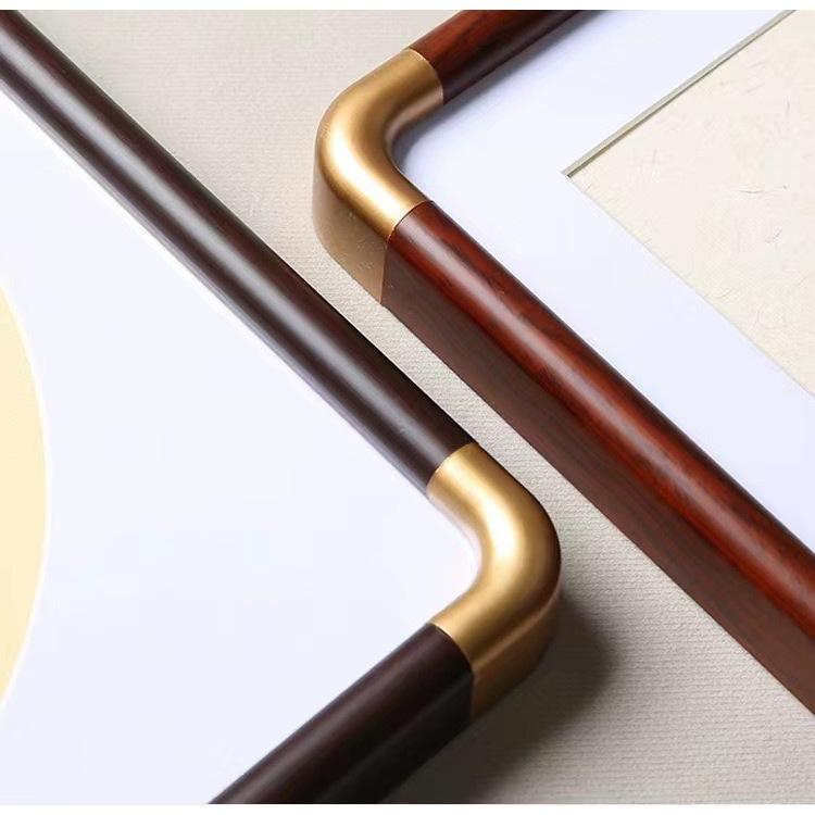 Khung treo tranh thuỷ mặc, thư pháp trang nhã, phù hợp thẩm mỹ, Chất liệu khung gỗ bo 4 góc tròn bằng nhựa tổng hợp sơn màu nhũ đồng sang trọng. Bộ khung gồm có
