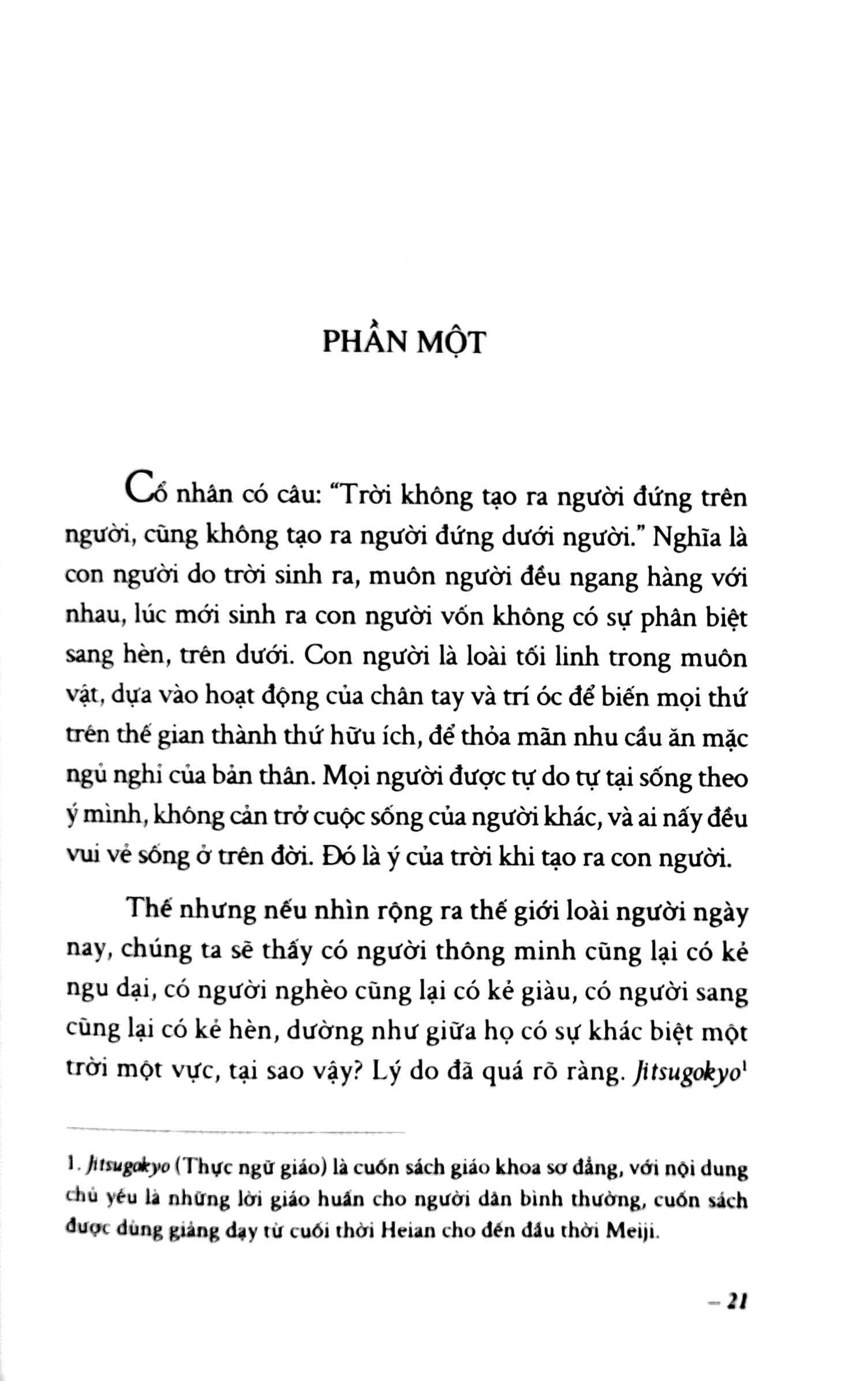 Với tuyên ngôn “Trời không tạo ra người đứng trên người và cũng không tạo ra người đứng dưới người”, Fukuzawa Yukichi đã gây kinh ngạc và bàng hoàng - như “không tin vào tai m.ình” - cho đa số người Nhật Bản vốn bị trói buộc bởi đẳng cấp, thân phận, quen phục tùng phó mặc và e sợ quan quyền suốt hàng trăm năm dưới chính thể phong kiến Mạc phủ. Ông khẳng định mọi người sinh ra đều bình đẳng và nếu có khác biệt là do trình độ học vấn.