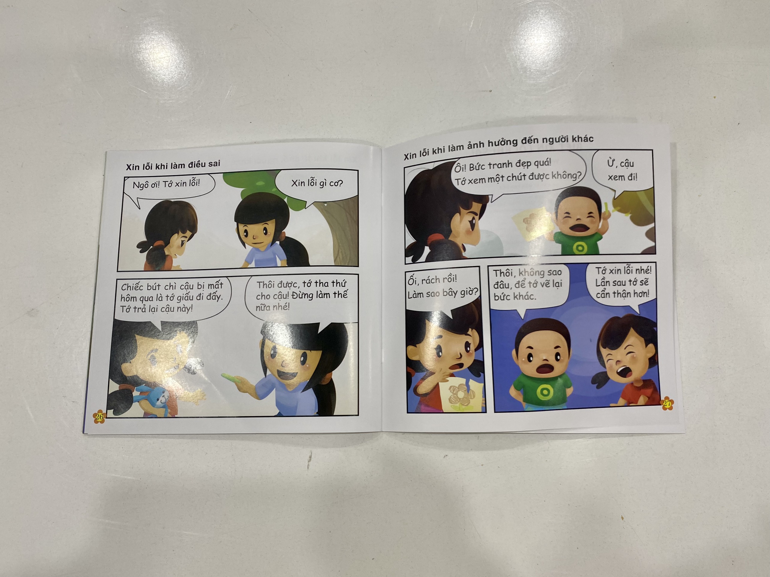 Bộ sách với những tình huống gần gũi, sẽ hướng dẫn các bé chào hỏi mọi người, biết nói lời cảm ơn khi được giúp đỡ, biết xin lỗi khi sai, biết giao tiếp với bạn bè và học cách giữ lời hứa. Đặc biệt, với những câu giao tiếp đơn giản song ngữ Việt - Anh sẽ giúp bé làm quen và hứng thú hơn với tiếng Anh.