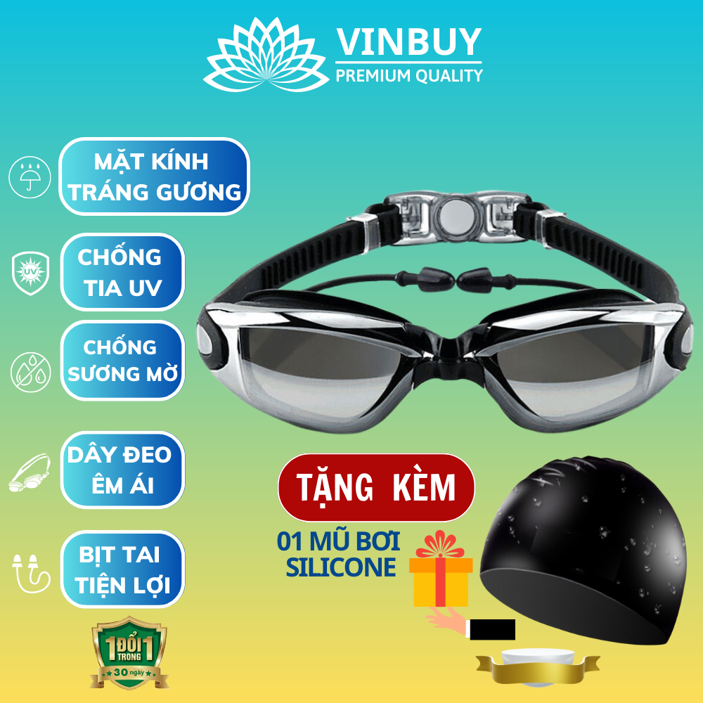 Mua tại TiktokKính Bơi Tráng Gương kèm bịt tai cao cấp VinBuy chống sương mù, chống tia UV Hàng chính hãng - Tặng kèm nón bơi Silicon (Màu ngẫu nhiên) Đặc tính sản phẩm: