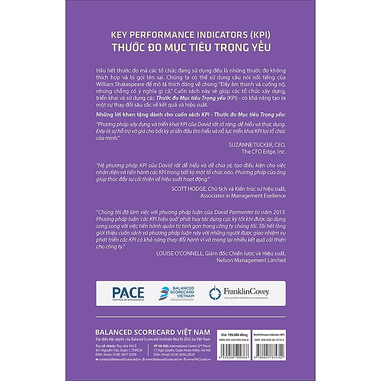 Nằm trong bộ sách “Triển khai chiến lược” do PACE dày công tìm kiếm, nghiên cứu và chọn lọc, có thể nói KPI là quyển sách được thực hiện công phu nhất, đầy đủ nhất và phổ biến nhất hiện nay. Cuốn sách này được biên soạn nhằm hỗ trợ các tổ chức trong việc xây dựng, triển khai và sử dụng hiệu quả các Thước đo Mục tiêu Trọng yếu (Key Performance Indicators; viết tắt KPI) – các thước đo hiệu quả công việc sẽ tạo ra sự khác biệt sâu sắc cho tổ chức của bạn.