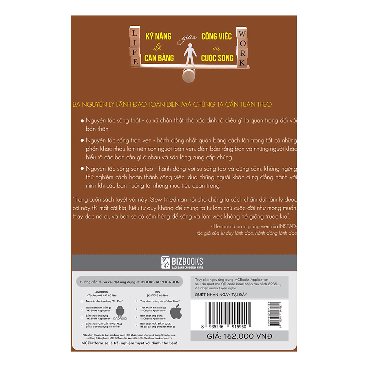• Nguyên tắc sống sáng tạo, không ngừng thử nghiệm cách hoàn thành công việc, đưa người khác cùng đồng hành với mình khi các bạn có chung những mục tiêu quan trọng. Ngoài ra, trong cuốn sách này bạn sẽ học được cách chấm dứt tâm lý được cái này, mất cái kia, kiểu tư duy không để chúng ta tự làm chủ cuộc đời như mong muốn. Hãy đọc nó và bạn sẽ có cảm hứng để sống và làm việc không hề giống như trước kia. Kỹ năng để cân bằng giữa công việc và cuộc sống Công việc và cuộc sống là hai bản thể tồn tại song song với nhau hàng ngày của bạn phải không? Khi mà chúng ta ngày càng bận rộn hơn với công việc thì cũng kèm theo đó là chuỗi ngày căng thẳng mà đến dây thần kinh cũng muốn đứt. Nếu như thời điểm trước đây, chúng ta làm việc 8h/ngày và trở về nhà nghỉ ngơi thì giờ đây mọi người thường xuyên mang việc về nhà. Họ liên tục kiểm tra công việc thông qua điện thoại di động ở nhà (ngay cả khi đó là thời gian cho bữa tối) và đọc báo cáo công việc vào tối muộn. Làm việc với lịch và cường độ như vậy sẽ gây tổn hại đến sức khỏe của mọi người. Đã đến lúc mọi người cần quan tâm đến bản thân mình nhiều hơn và tìm cách cân bằng giữa công việc và cuộc sống gia đình. Bạn đã bao giờ nghĩ đến một cách nào đó để mình có thể cân bằng mọi thứ, ít nhất là công việc và cuộc sống để mình có dư giả chút thời gian bên con lâu hơn, bên gia đình lâu hơn hay thời gian cho chính bản thân mình thêm chút nữa. Nhiều cuốn sách phát triển cá nhân gợi ý rằng bạn nên kết hợp thời gian làm việc và giải trí để giảm bớt căng thẳng. Tuy nhiên, trong thực tế việc này không hề dễ dàng. Để cân bằngtốt giữa thời gian cho công việc, gia đình, bạn bè và bản thân bạn cần có những kỹ năng quản lý căng thẳng. Hãy suy nghĩ nghiêm túc về việc cân bằng cuộc sống cho dù bạn đang gặp phải áp lực từ gia đình hay các vấn đề liên quan đến công việc. Lý do bạn mất cân bằng giữa công việc và cuộc sống? Có rất nhiều lý do mà tôi thu thập được từ rất nhiều cá nhân khi phỏng vấn trực tiếp họ cái lý do mà họ thấy mọi thứ đang không còn cân bằng kể từ ngày họ đi làm. Một trong số đó: