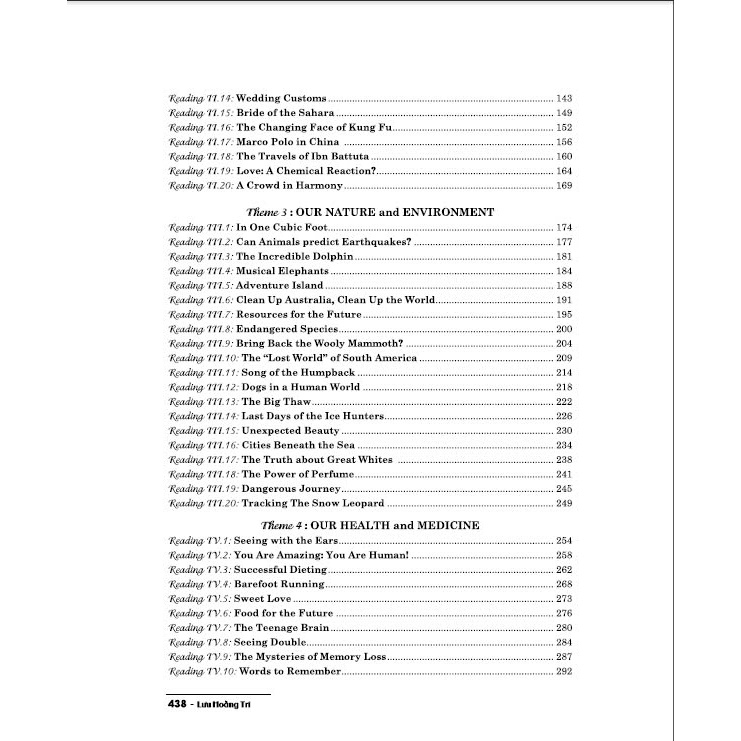 Các bài đọc được chia thành những chủ đề thường gặp trong các đề thi như: Our Society (Xã hội của chúng ta); Our Culture (Nền văn hóa của chúng ta);