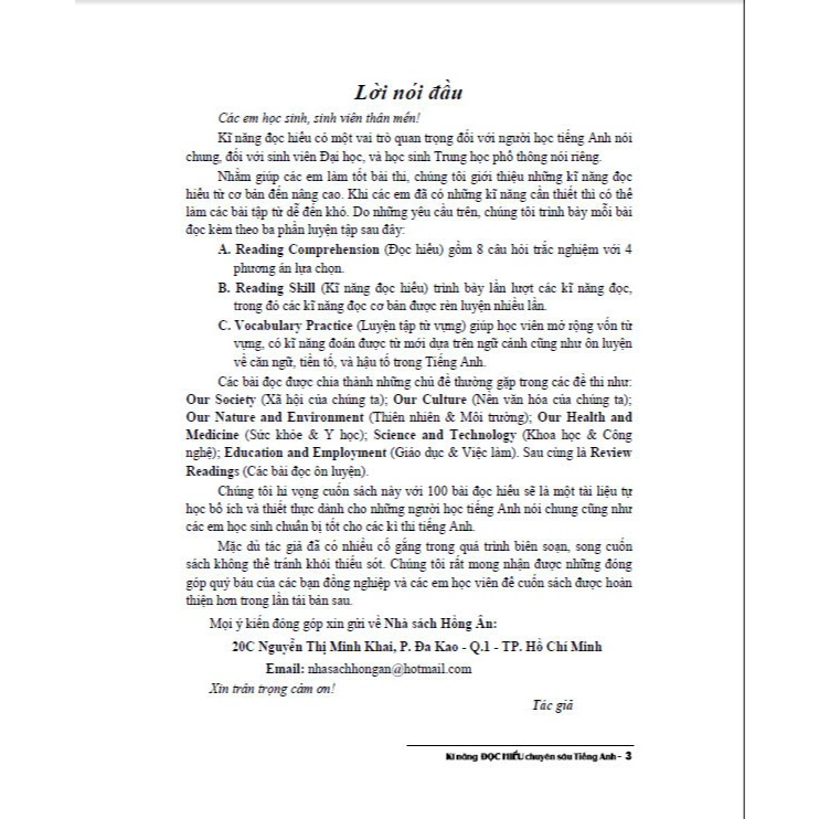 Chúng tôi hi vọng cuốn sách này với 100 bài đọc hiểu sẽ là một tài liệu tự học bổ ích và thiết thực dành cho những người học tiếng Anh nói chung cũng như các em học sinh chuẩn bị tốt cho các kì thi tiếng Anh.