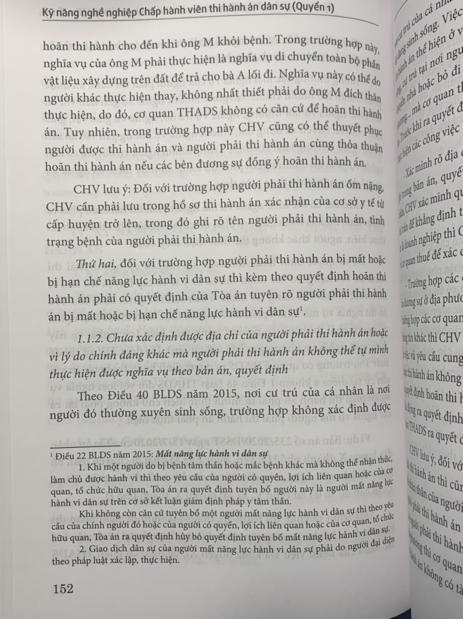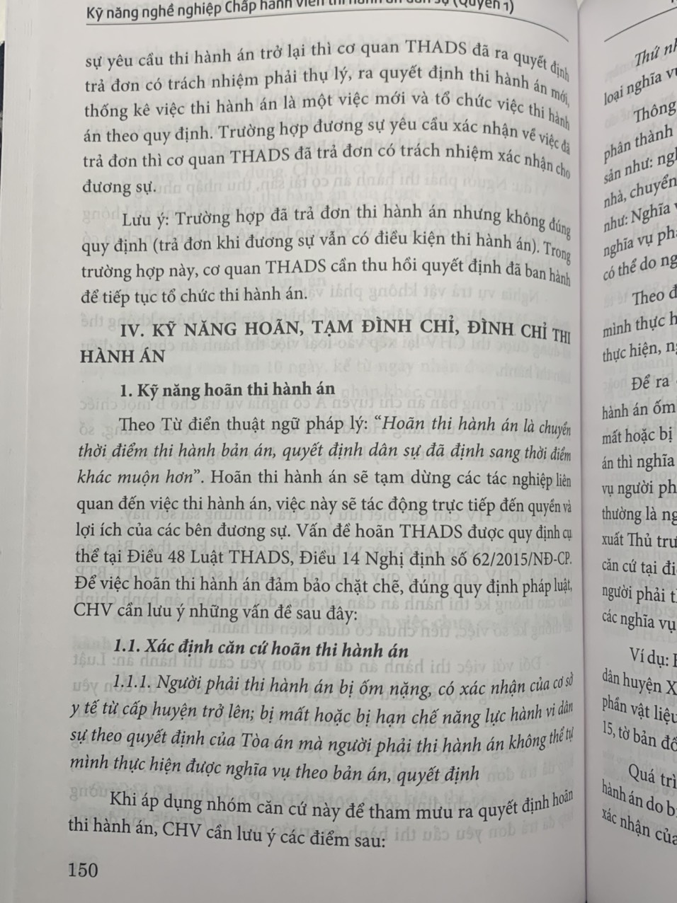 Nhà Xuất bản Tư pháp và Nhóm tác giả: Ths. GV.Hoàng Thị Thanh Hoa, Ths. Hồ Quân Chính, TS. Nguyễn Văn Nghĩa xin trân trọng giới thiệu tới Quý bạn đọc cuốn sách mới “Kỹ năng nghề nghiệp Chấp hành viên Thi hành án Dân sự” Đây là cuốn sách chứa đựng những kỹ năng quan trọng và thiết yếu có giá trị tham khảo và ứng dụng cao đối với Chấp hành viên Thi hành án Dân sự trong quá trình tổ chức thi hành án. Cuốn sách dày 600 trang, kết cấu được xây dựng bám theo thủ tục THADS trên cơ sở cập nhật tất cả các văn bản pháp luật về THADS và các lĩnh vực pháp luật khác có liên quan được áp dụng đối với từng thủ tục một cách chi tiết giúp người đọc dễ dàng tra cứu. Những giá trị quý báu mà cuốn sách mang đến cho bạn đọc: ứng với mỗi tác nghiệp của Chấp hành viên đều được chỉ rõ cơ sở pháp lý; thủ tục thi hành án được phân tích chặt chẽ trên cơ sở quy định của pháp luật; cùng với những điểm nhấn cần lưu ý khi áp dụng pháp luật và những kinh nghiệm thực tiễn vào việc tổ chức thi hành án; trang bị những “kỹ năng mềm” cần thiết trong quá trình tổ chức thi hành án. Bên cạnh ý nghĩa là một cuốn sách “kỹ năng nghề” của Chấp hành viên, cuốn sách còn có giá trị tham khảo đối với những người làm công việc chuyên ngành Tư pháp như Kiểm sát viên, Thẩm phán, Thừa phát lại… và các học viên chuyên ngành Luật cũng như đông đảo Quý độc giả. Nhóm tác giả hy vọng cuốn sách “Kỹ năng nghề nghiệp Chấp hành viên thi hành án dân sự” sẽ là người bạn đồng hành tin cậy đối với đồng nghiệp công tác trong hệ thống Thi hành án dân sự và đông đảo Quý bạn đọc quan tâm! Giá sách là 260.000 đồng/cuốn.