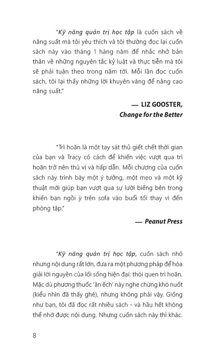 “Kỹ Năng Quản Trị Học Tập” tập trung vào việc hướng dẫn học sinh, sinh viên cách xác định và ưu tiên những nhiệm vụ quan trọng nhất trong học tập và cuộc sống. Mỗi chương của cuốn sách đều mang đến những nguyên tắc và kỹ thuật cụ thể, giúp độc giả vượt qua trì hoãn, tăng cường tập trung và tối ưu hóa thời gian học tập. Trong cuốn sách, Tracy đề cập đến 22 nguyên tắc quản lý thời gian, từ “Xử lý đơn lẻ từng nhiệm vụ một” đến “Nâng cấp các kỹ năng sở trường của bạn”
