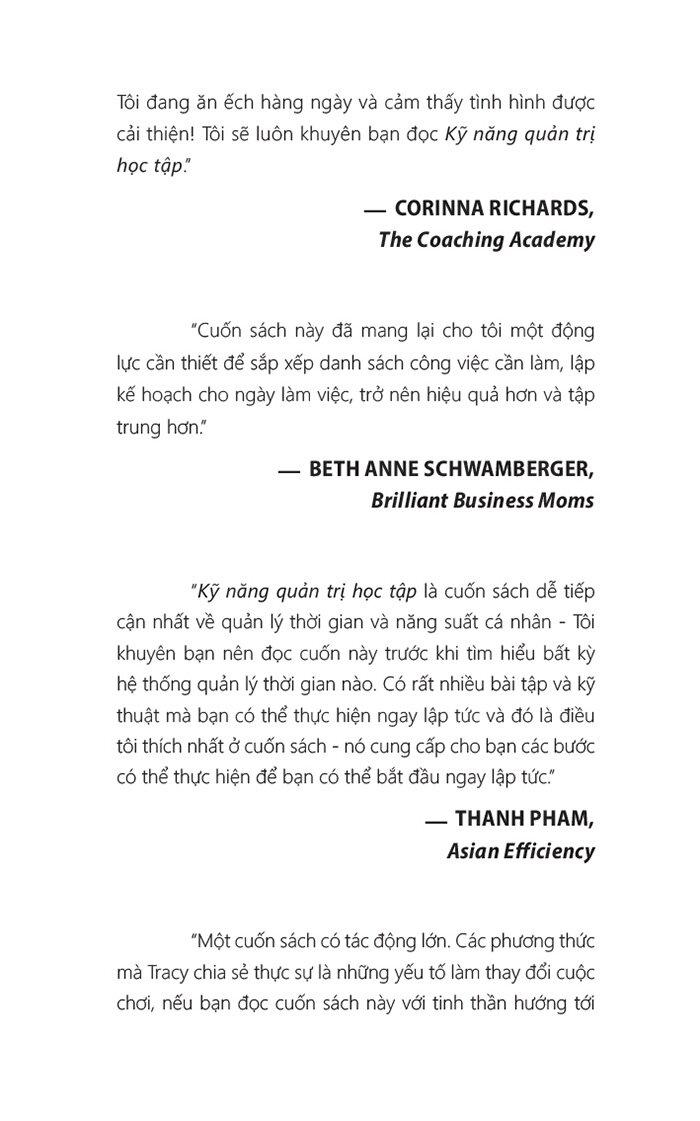 “Kỹ Năng Quản Trị Học Tập” đã giúp hàng triệu người trên thế giới hoàn thành được nhiều việc hơn trong thời gian ngắn hơn. Brian Tracy cung cấp cho độc giả những lời khuyên, công cụ và kỹ thuật để sắp xếp thời gian, đặt mục tiêu, tập trung vào nhiệm vụ (ngay cả khi nhiệm vụ ấy không thú vị), giải quyết căng thẳng và phát triển các kỹ năng để đạt được nhiều hơn những gì họ từng nghĩ là có thể.