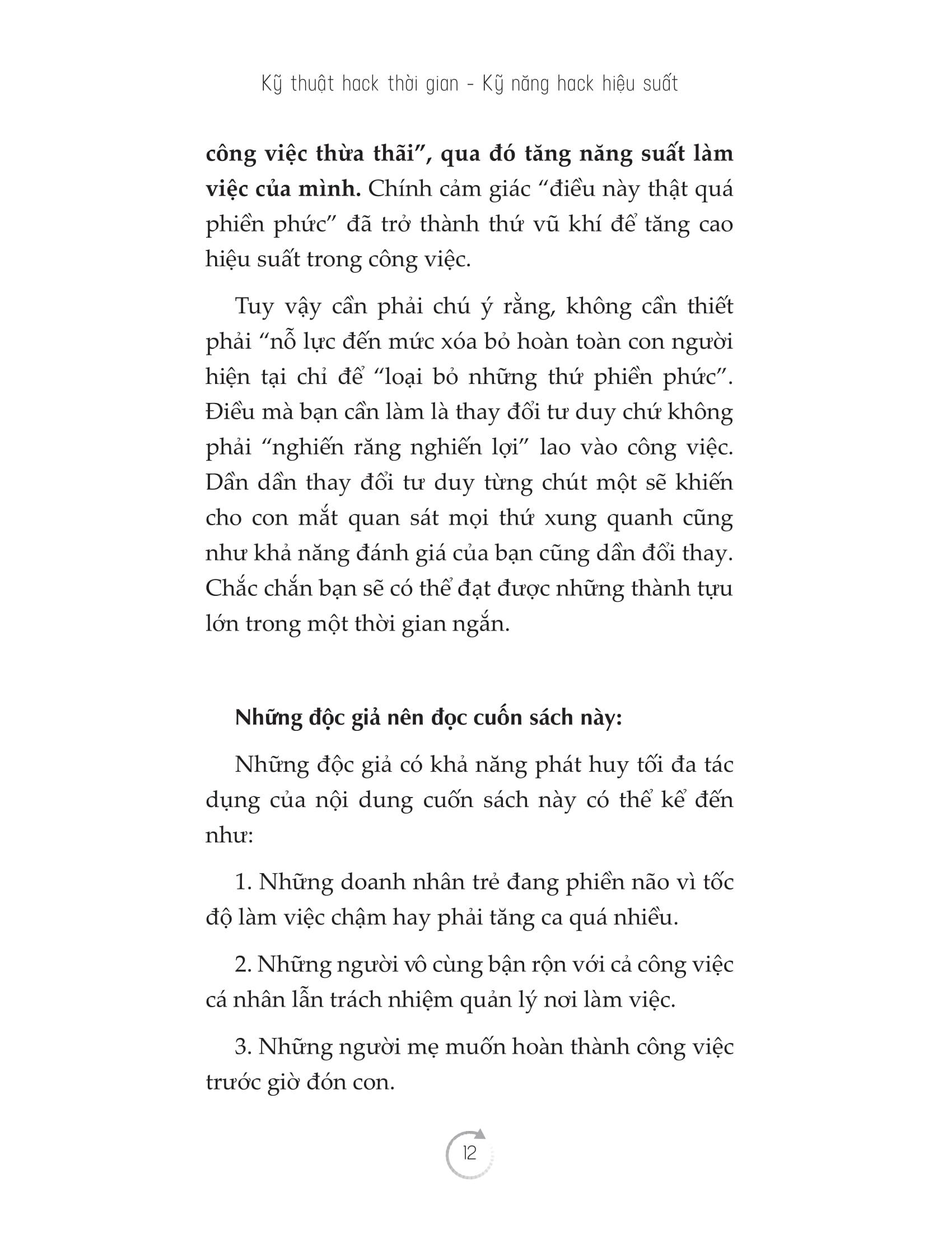 Nếu bạn đang rơi vào những tình huống như trên và cảm thấy mệt mỏi rã rời, điều bạn đang cần lúc này là phương thức để có thể “xử lý một cách thật hiệu quả mà không cần nhiều nỗ lực”. Hãy bắt đầu sắp xếp lại công việc và cuộc sống của bạn với “Kỹ thuật hack thời gian - Kỹ năng hack hiệu suất”, cuốn sách mang đến những phương thức để có thể xử lý công việc một cách hiệu quả mà không cần phải nỗ lực quá nhiều.