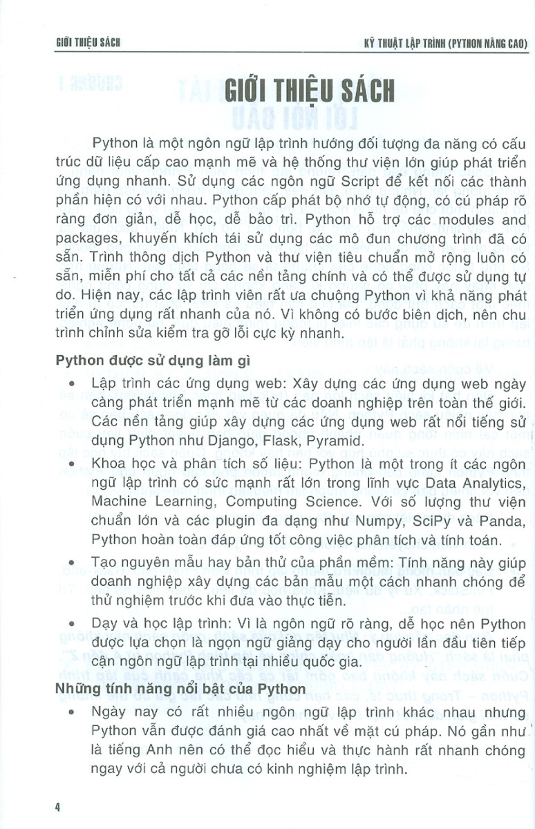Mua tại TiktokKỹ Thuật Lập Trình Python Nâng Cao Về cuốn sách này Đến bất kỳ hiệu sách lớn nào (trực tiếp hoặc trực tuyến), bạn sẽ tìm thấy rất nhiều sách Python. Nếu đã quen với việc đọc sách bạn sẽ có một cái nhìn tổng quan nhanh chóng giúp bạn quyết định liệu cuốn sách này có thực sự phù hợp với bạn hay không. Cuốn sách này mong muốn phổ cập ngôn ngữ Python đến với nhiều bạn có mong muốn tìm hiểu lập trình máy tính. Sách được viết cho các đối tượng chính sau: Không yêu cầu người học có kinh nghiệm lập trình trước đó. Học sinh phổ thông. Sinh viên chuyên hay không chuyên ngành CNTT. Các bạn mong muốn trở thành lập trình viên Front-end, Back-end,