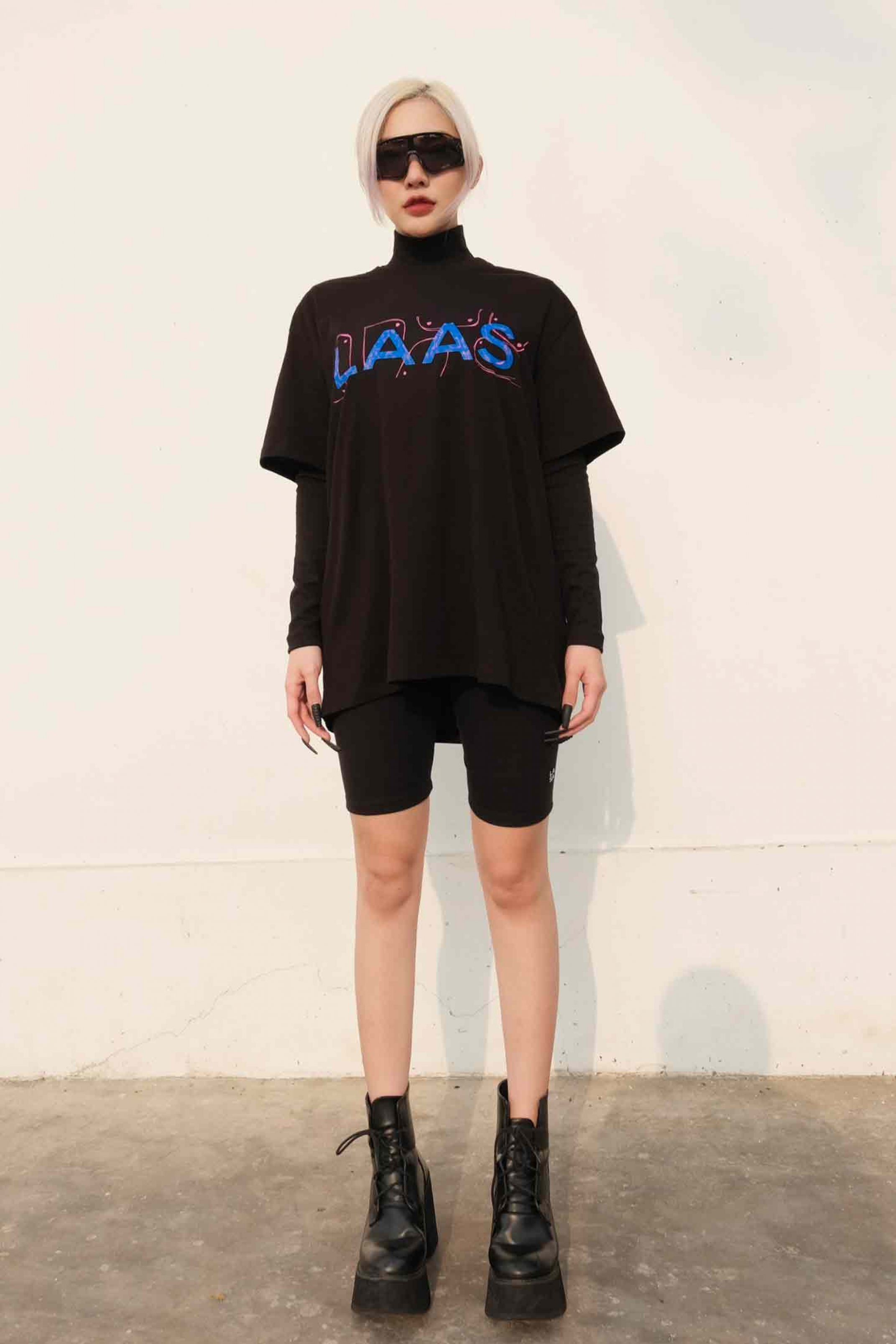 100% COTTON 2 CHIỀU, DÀY DẶN THOÁNG MÁT ÁO MÀU ĐEN FORM RỘNG ĐIỂM NHẤN HÌNH IN CHỮ LAAS MÀU XANH, HỒNG