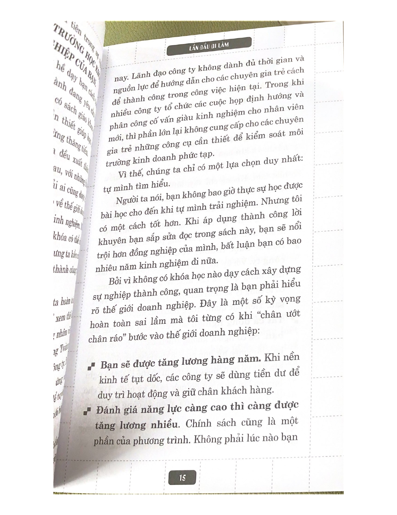 Lần Đầu Đi Làm-Vanlangbooks I.Giới thiệu sách Trường đại học KHÔNG dạy bạn cách thành công trong thế giới công việc. Không có bất kỳ khóa học hay giáo trình nào hướng dẫn cách xây dựng một sự nghiệp thành công mà nhiều người khao khát. "Lần Đầu Đi Làm" sẽ giúp bạn lấp đầy lỗ hổng kiến thức đó. Sách đưa ra những lời khuyên phù hợp cho bạn trẻ – những chuyên gia trẻ – đang tìm cách gầy dựng nền tảng vững chắc cho sự nghiệp. Sách sẽ cung cấp cho bạn: