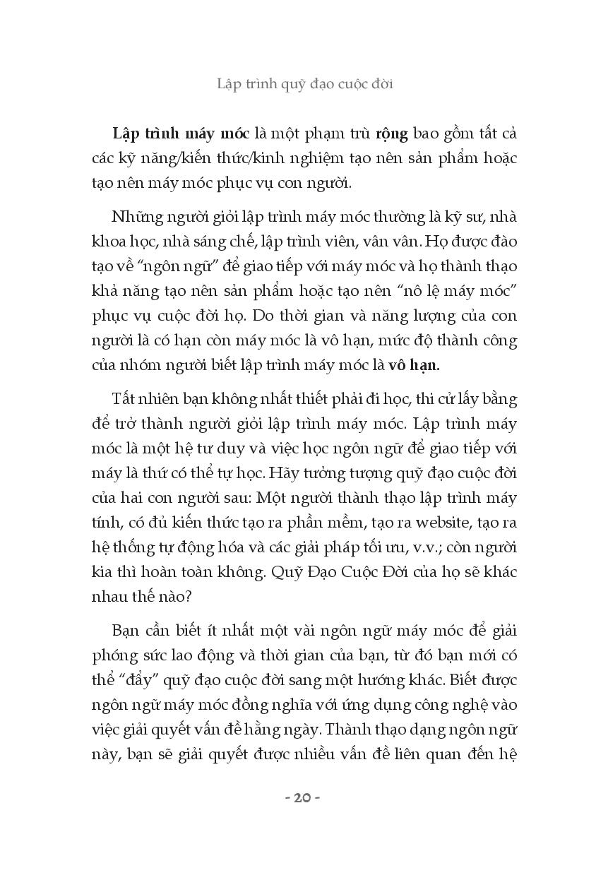 Lập trình Quỹ Đạo Cuộc Đời đem đến cho bạn những hệ tư duy khiến bạn hiểu vấn đề một cách tường tận qua những ví dụ và lập luận logic. Bạn có cơ hội được đi sâu khám phá bản chất của mọi hành vi. Mình muốn bạn trước khi phát triển bản thân, có thể nhận thức được mọi thứ rõ như ban ngày. Đọc vị được chính bạn, sau đó đến người khác và các chiến thuật tồn tại ở cái thế kỷ XXI hỗn loạn này.