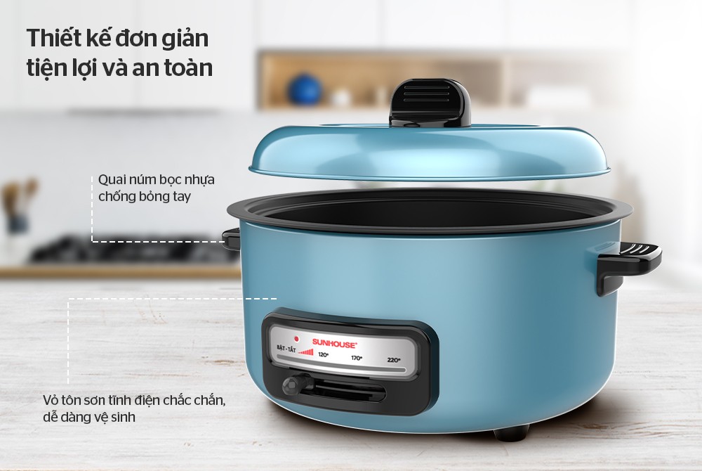 Thiết kế trang nhã, gọn nhẹ Nồi lẩu điện Sunhouse SH525 có thân nồi làm từ thép sơn tĩnh điện có khả năng chịu nhiệt cao và ít bị ảnh hưởng bởi môi trường. Màu sắc
