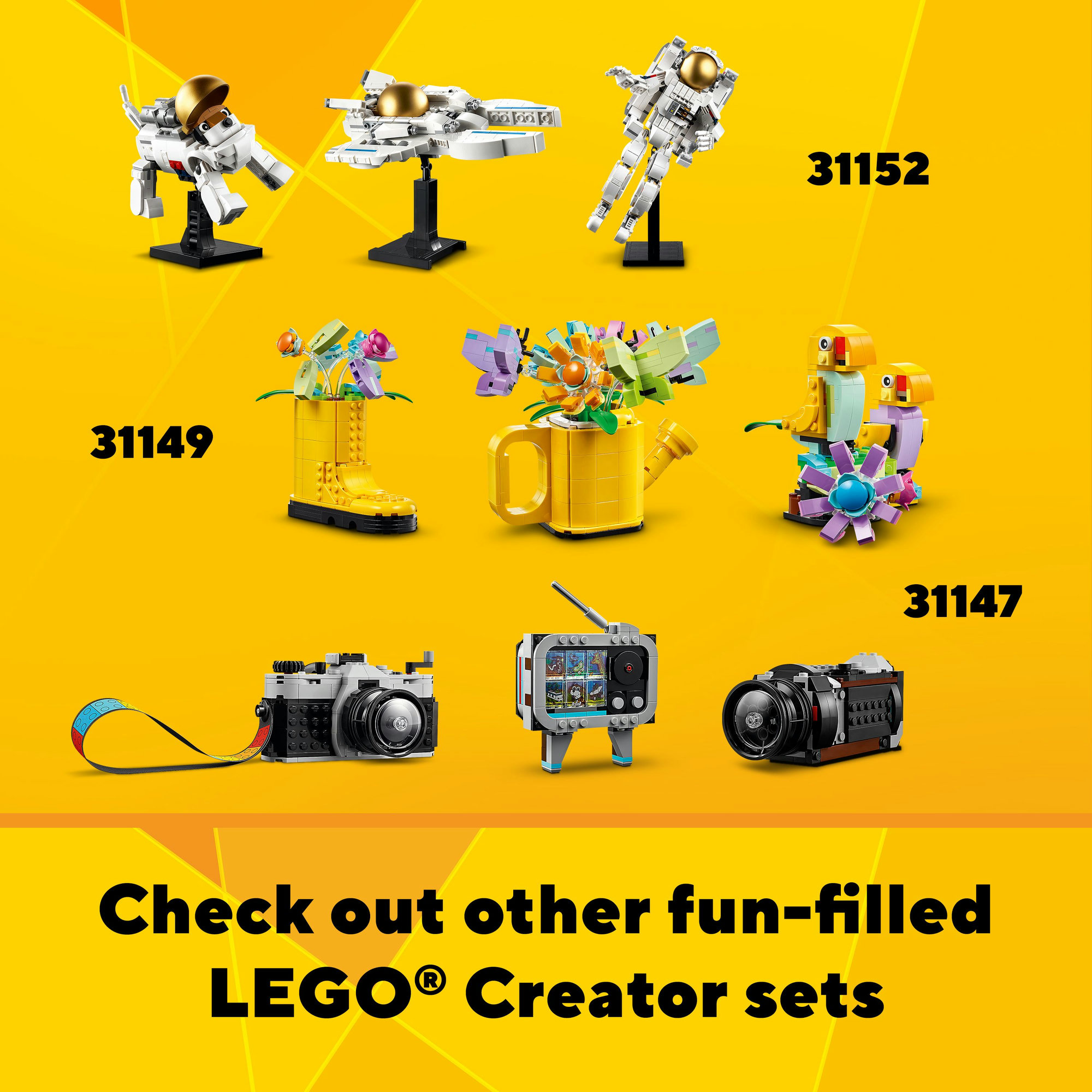 • LEGO Creator 3 trong 1– Mỗi LEGO Creator cho phép bé có thể xây dựng 3 mô hình khác nhau chỉ trong 1 bộ, có thể bao gồm động vật, xe cộ và cảnh quan chi tiết của thành phố…