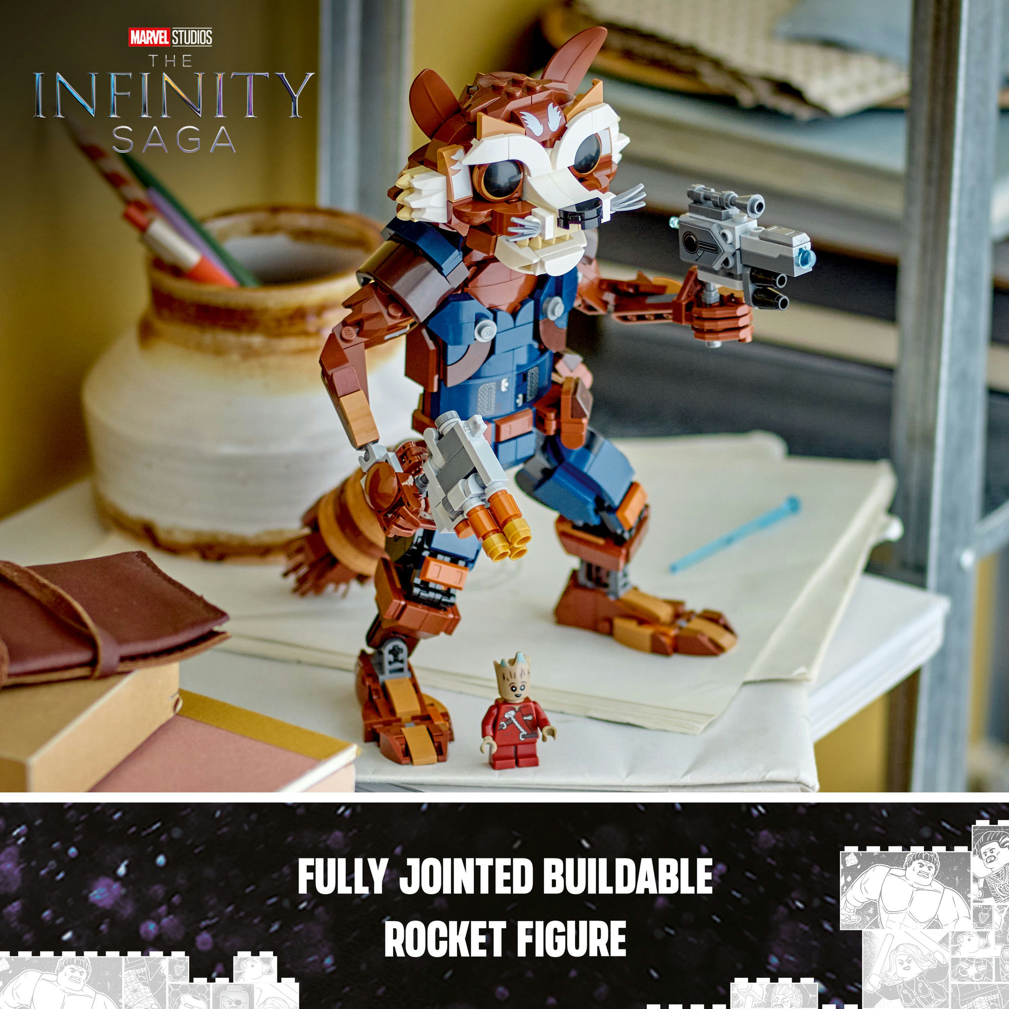 Tái hiện lại cuộc phiêu lưu của những Vệ Binh Dải Ngân Hà của Marvel Studios với nhân vật Gấu mèo Rocket! Rocket có thể di chuyển, xoay người và tấn công bất kỳ ai hoặc bất cứ thứ gì cản đường anh ta. Anh ấy thậm chí còn mang theo người bạn thân nhất của mình, Baby Groot trên vai!