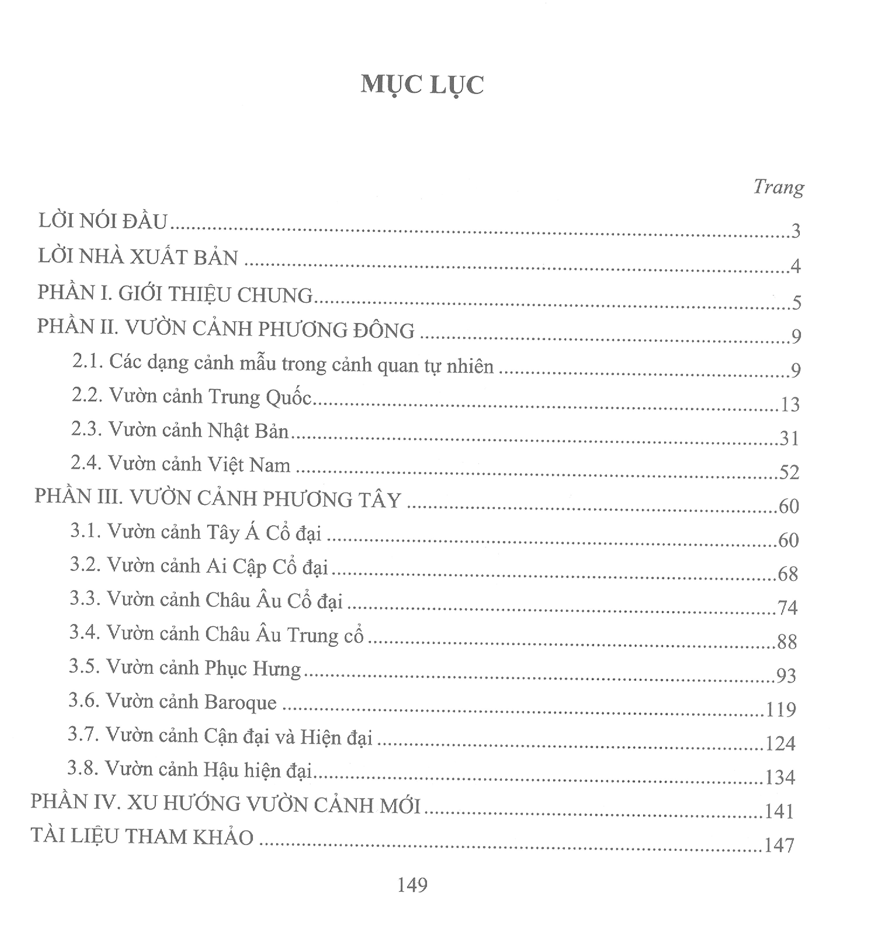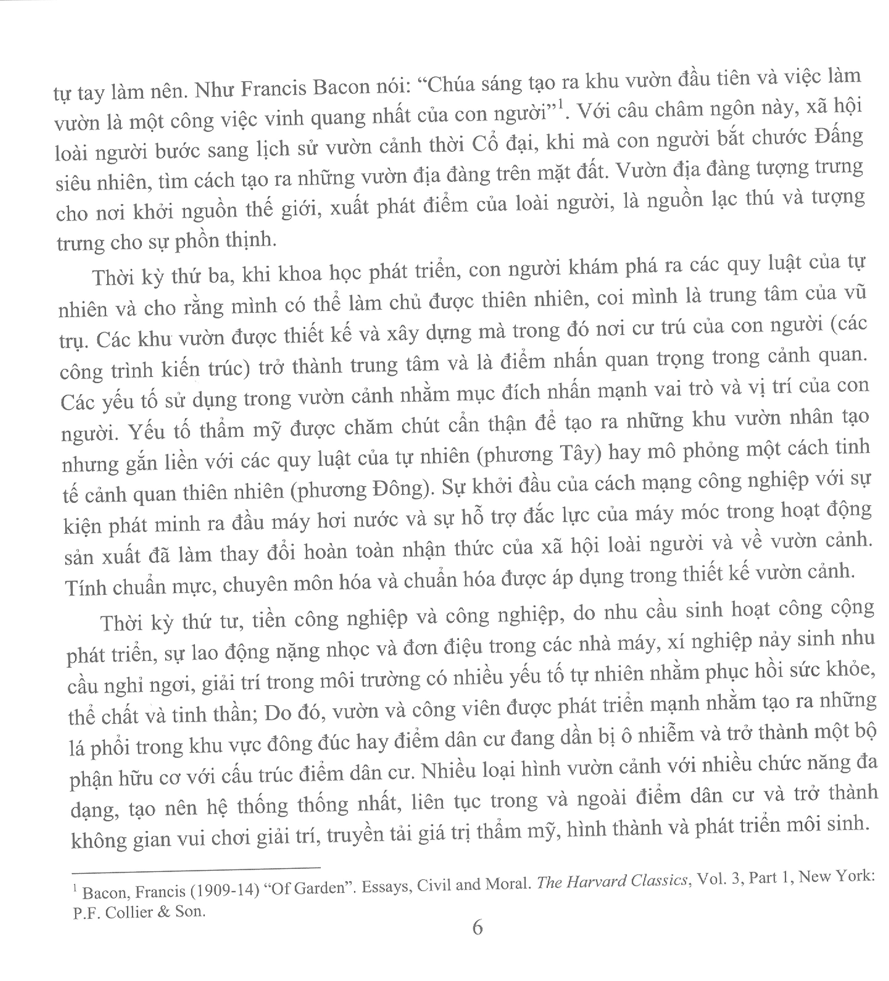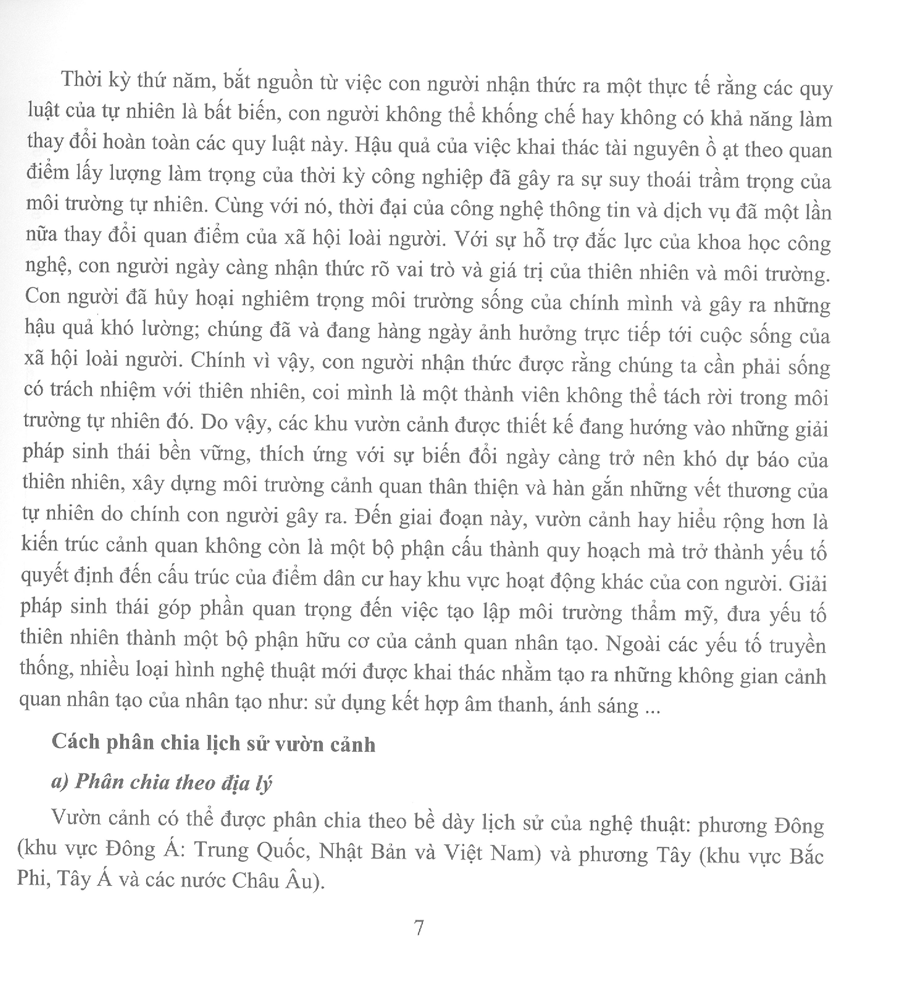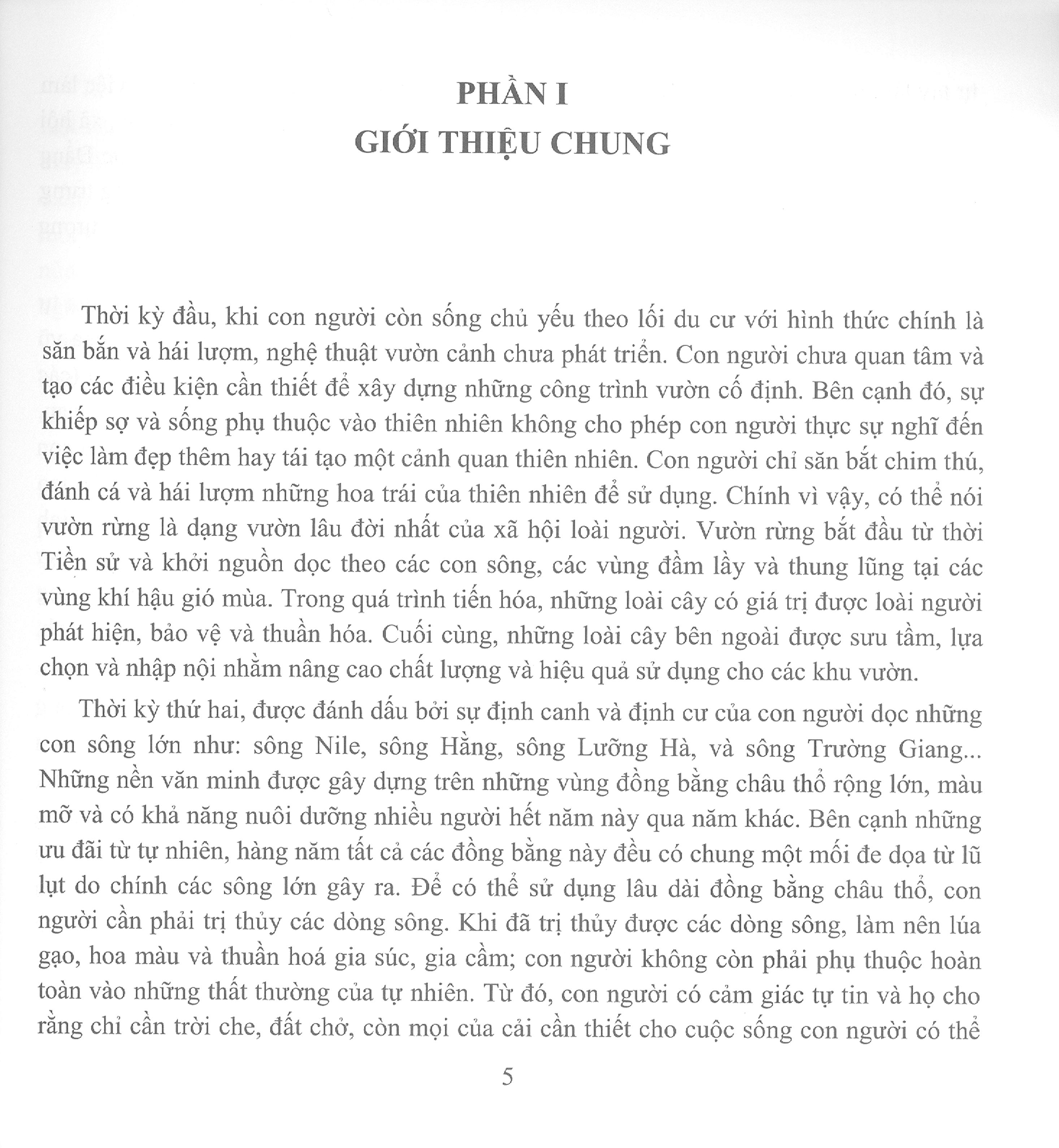Lịch Sử Vườn Cảnh Có thể nói, từ khi con người bắt đầu định cư dọc theo các con sông lớn như sông Nile, sông Hằng, sông Lưỡng Hà, sông Trường Giang hay sông Hồ là sự khởi đầu cho các nghệ thuật làm vườn. Lịch sử vườn cảnh có vai trò hết sức quan trọng trong quá trình phát trỉển của ngành Kiến trúc Cảnh quan sau này. Bên cạnh tìm kiếm những xu hướng và triết lý mới, cảc giá trị vườn cảnh trong từng giai đoạn phát triền của nhân loại đều có ảnh hưởng lớn đến nguyên tắc và giải pháp thiết kế cảnh quan, quy hoạch cảnh quan cũng như quy hoạch đô thị và nông thôn trong môi giai đoạn của lịch sử phát trỉến xã hội loài người. Cuốn sách “Lịch sử vườn cảnh” được biên soạn nhằm cung cấp các thông tin về điều kiện, lịch sử hình thành và phát trin, những nét đặc trưng, các nguyên tắc cơ bản trong bố cục, tạo hình và tô chức không gian của các loại hình vườn cảnh tiêu biêu, có ảnh hưởng nhiều tới nhận thức và giá trị thẩm mỹ của cảnh quan trên Thế giới và Việt Nam. Tài liệu mong muốn cung cấp thông tin cho sinh viên ngành Kiến trúc, Quy hoạch, Kiến trúc Cảnh quan, Lâm nghiệp đô thị, những tổ chức, cá nhân hoạt động trong lĩnh vực hoặc quan tâm đến Quy hoạch Cảnh quan và Thiết kế Cảnh quan.