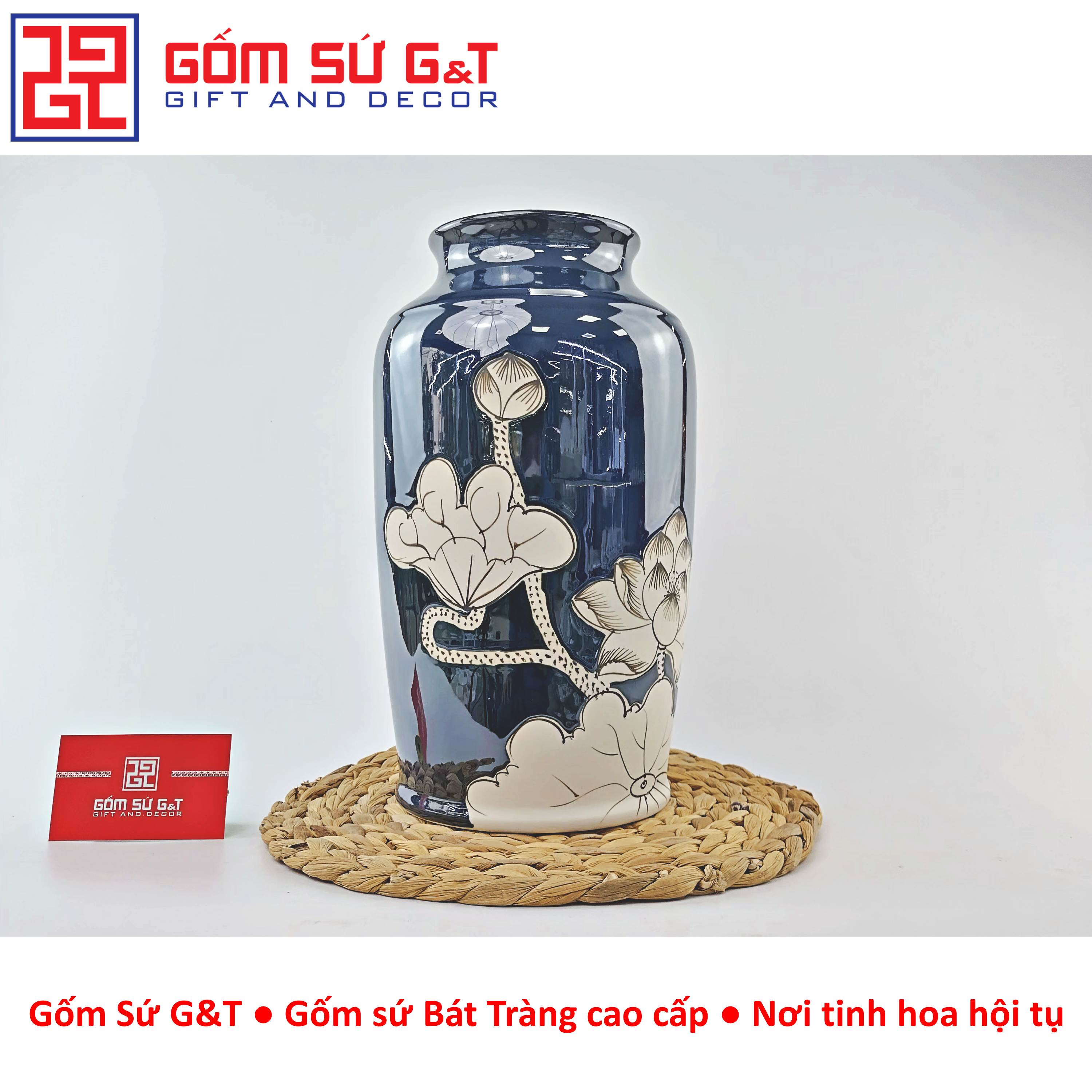 Bình hoa cao cấp Bát Tràng, hàng chuẩn loại 1, dáng chum họa tiết đắp nổi được thực hiện thủ công 100% bởi bàn tay lành nghề của các nghệ nhân làng nghề. Sản phẩm
