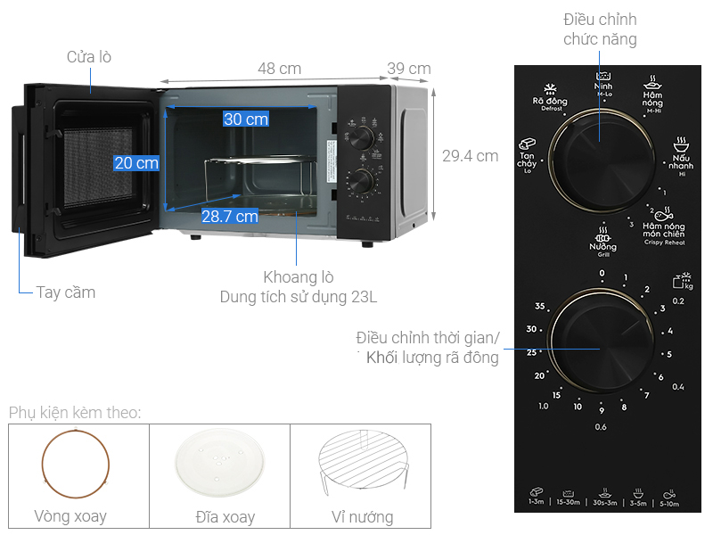 Lò vi sóng dung tích 20 lít, có thể bỏ vừa gà nguyên con 1kg Công suất vi sóng tối đa 1270W, nướng tới 1000W nấu nhanh Lò vi sóng có 4 chức năng chính: